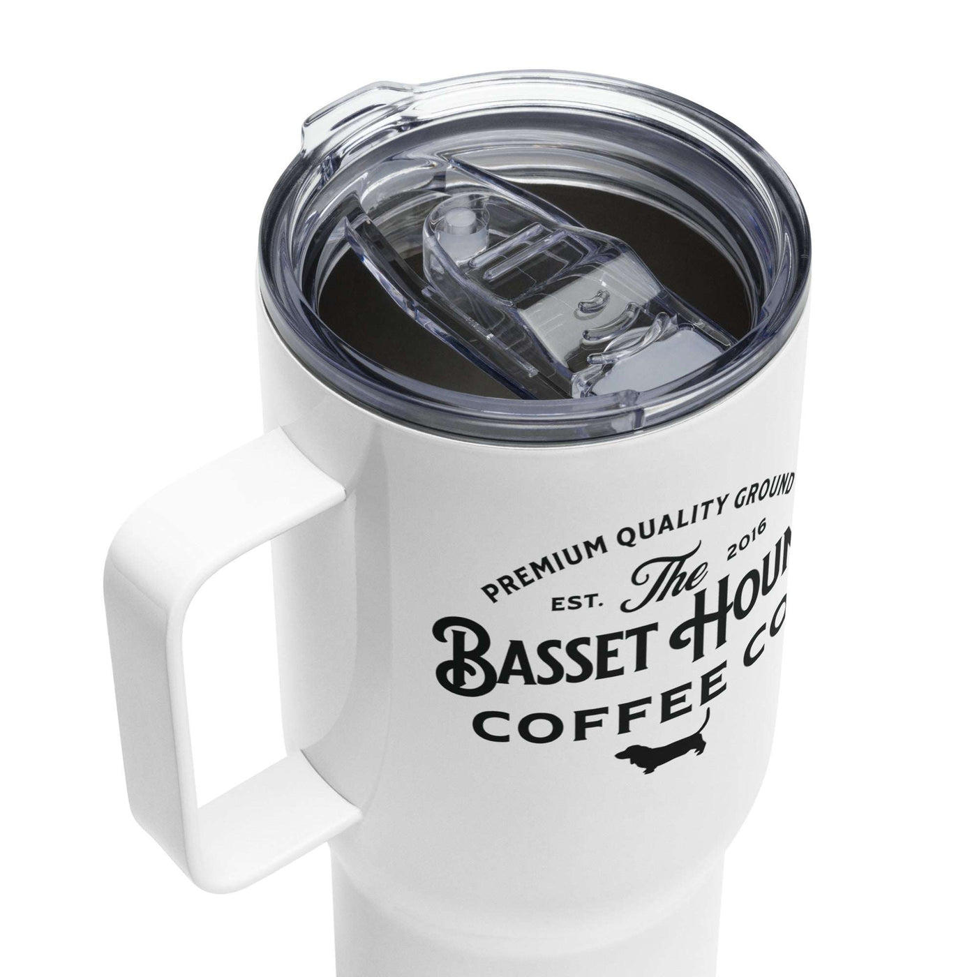 Introducing our stylish 25-ounce stainless steel travel mug, perfect for coffee lovers and dog enthusiasts! Featuring an adorable silhouette of a Basset Hound, this mug is printed on both sides with "Basset Hound Coffee Company," making it a delightful accessory for your daily adventures. Designed with a convenient handle and a secure plastic press-in lid, it fits perfectly in your car cup holder, allowing you to take your favorite beverages on the go. Please note that this mug is hand wash only, ensuring it maintains its charming design for years to come. Whether you’re heading to work or embarking on a new adventure, this travel mug is the ideal companion for every coffee lover!