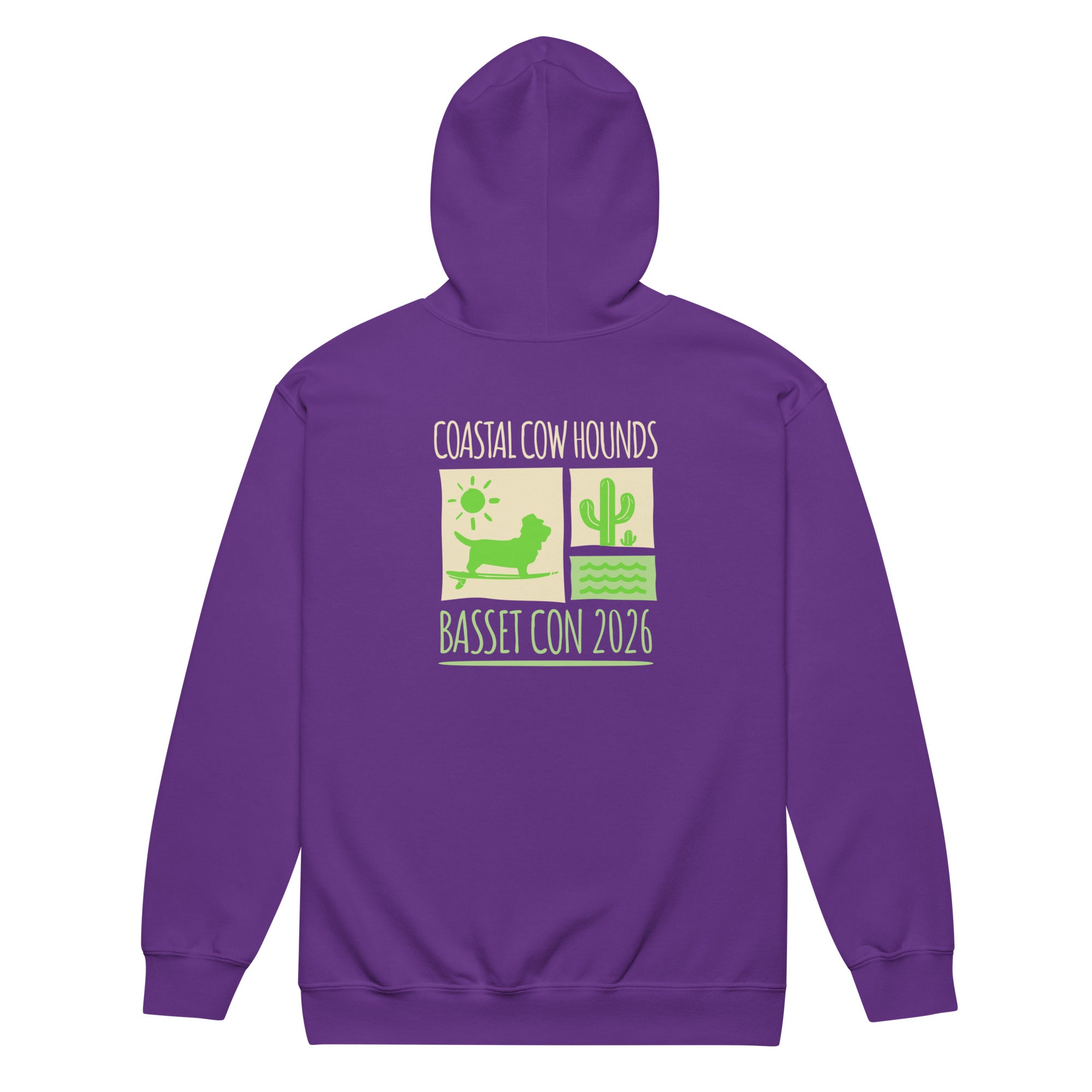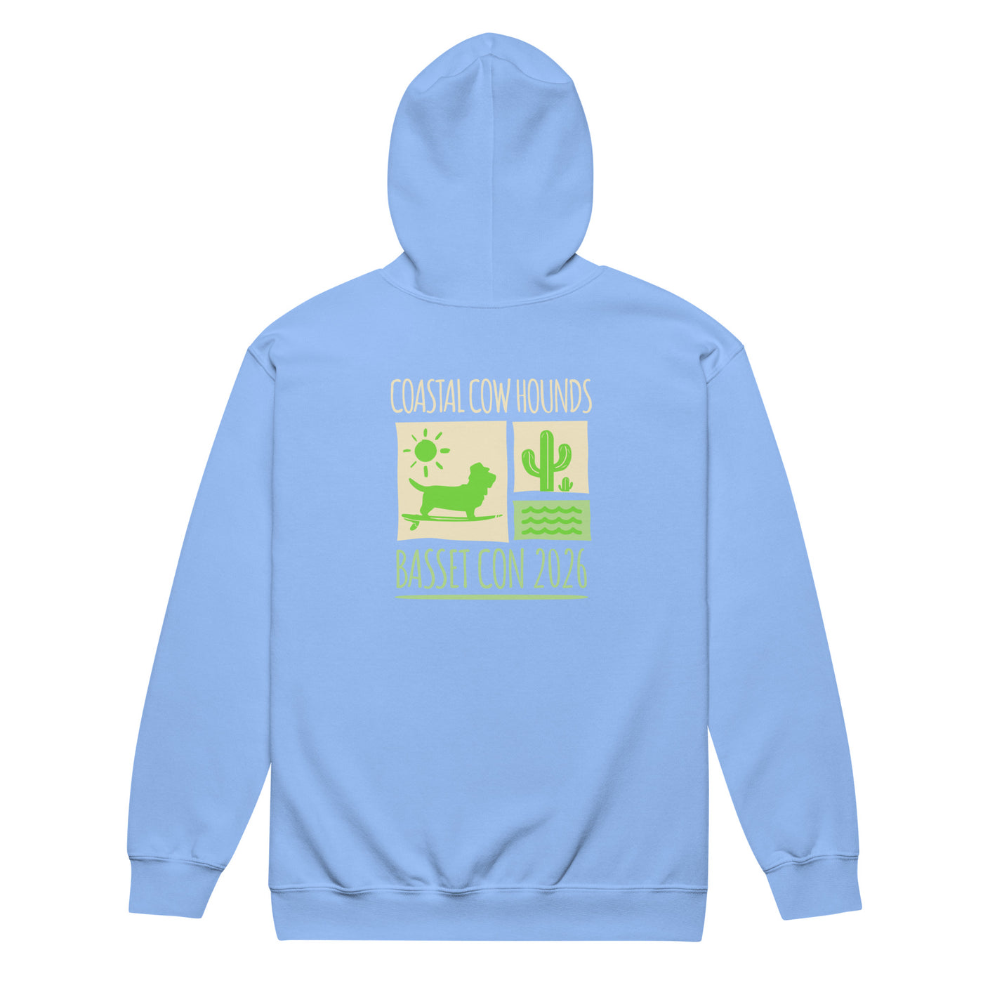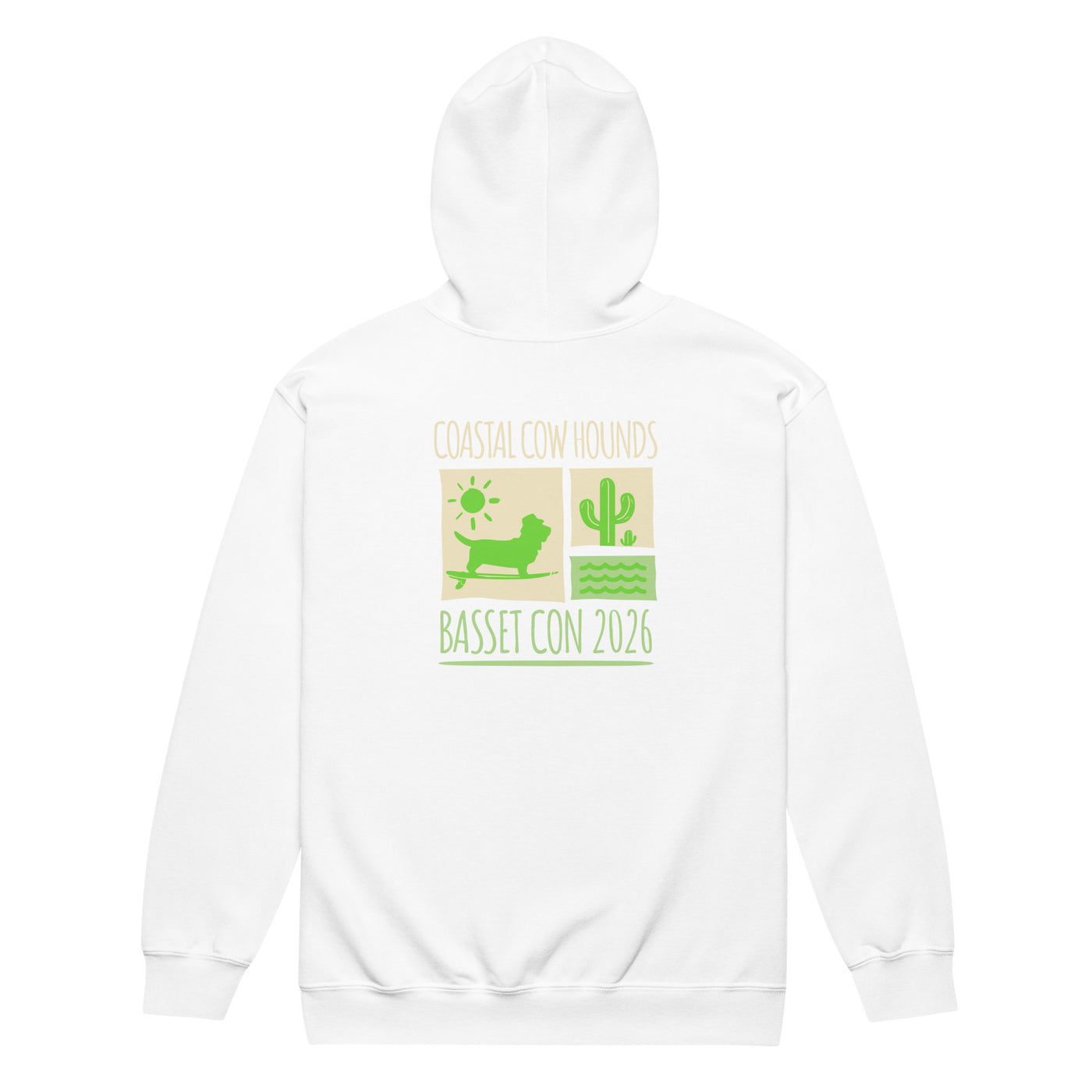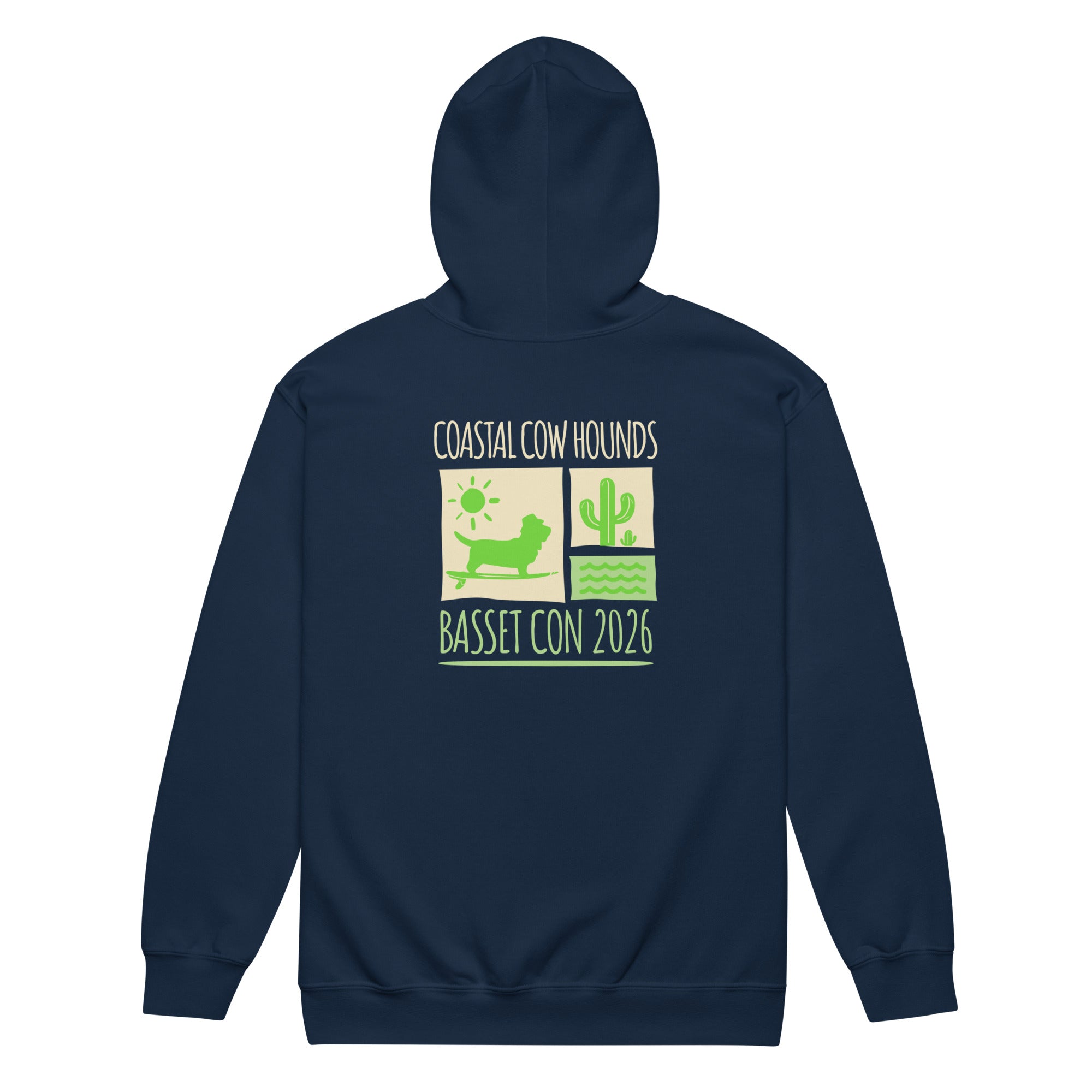 Introducing the Basset Con Wave zipper hoodie, designed for Basset Hound lovers who embrace the vibrant spirit of Basset Con 2026 in beautiful Carmel-by-the-Sea, California! This stylish hoodie features a stunning silhouette of a Basset Hound amidst a wave and cactus design, creating a perfect blend of fun and flair. The front showcases a cool graphic that captures the essence of the event, making it ideal for dog owners looking to celebrate their passion for Basset Hounds. Stay comfortable while you enjoy the festivities and connect with fellow Basset enthusiasts!