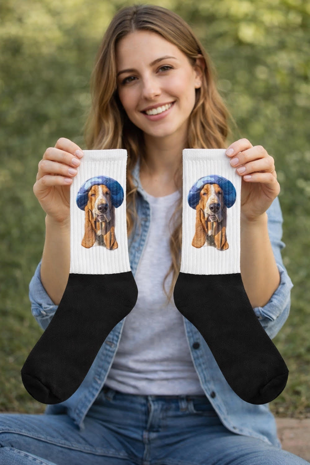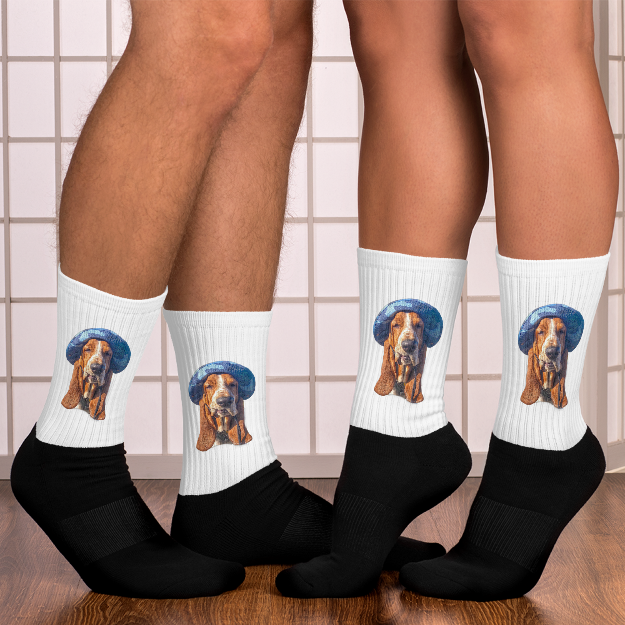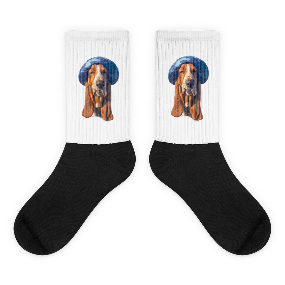 Introducing our exclusive crew-length socks featuring the beloved Bentley Waffles, the coolest Basset Hound in a stylish blue camo hat! Designed for comfort, each pair boasts a soft cushion bottom and a sleek black foot, with vibrant artwork elegantly printed along the leg. Perfect for showing off your love for cool dogs and adding flair to your casual wear. Step into comfort and style while celebrating your furry friend—get your Bentley Waffles socks today!