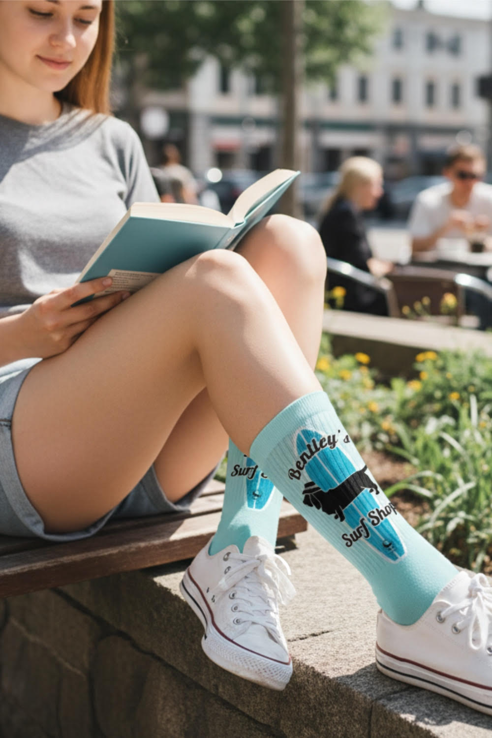 Introducing Bentley's Surf Shop Socks, the perfect blend of style and comfort for your summer adventures! These vibrant crew-length socks feature a fun surfboard design with a silhouette of Bentley Waffles, the charming Basset Hound, ready to ride the waves. Ideal for beach outings or casual wear, these socks celebrate the sunny vibes of summertime. The soft cushion bottom ensures all-day comfort, making them perfect for relaxing at the beach or strolling along the boardwalk. Show off your love for all things coastal and your favorite furry friend with Bentley's Surf Shop Socks!