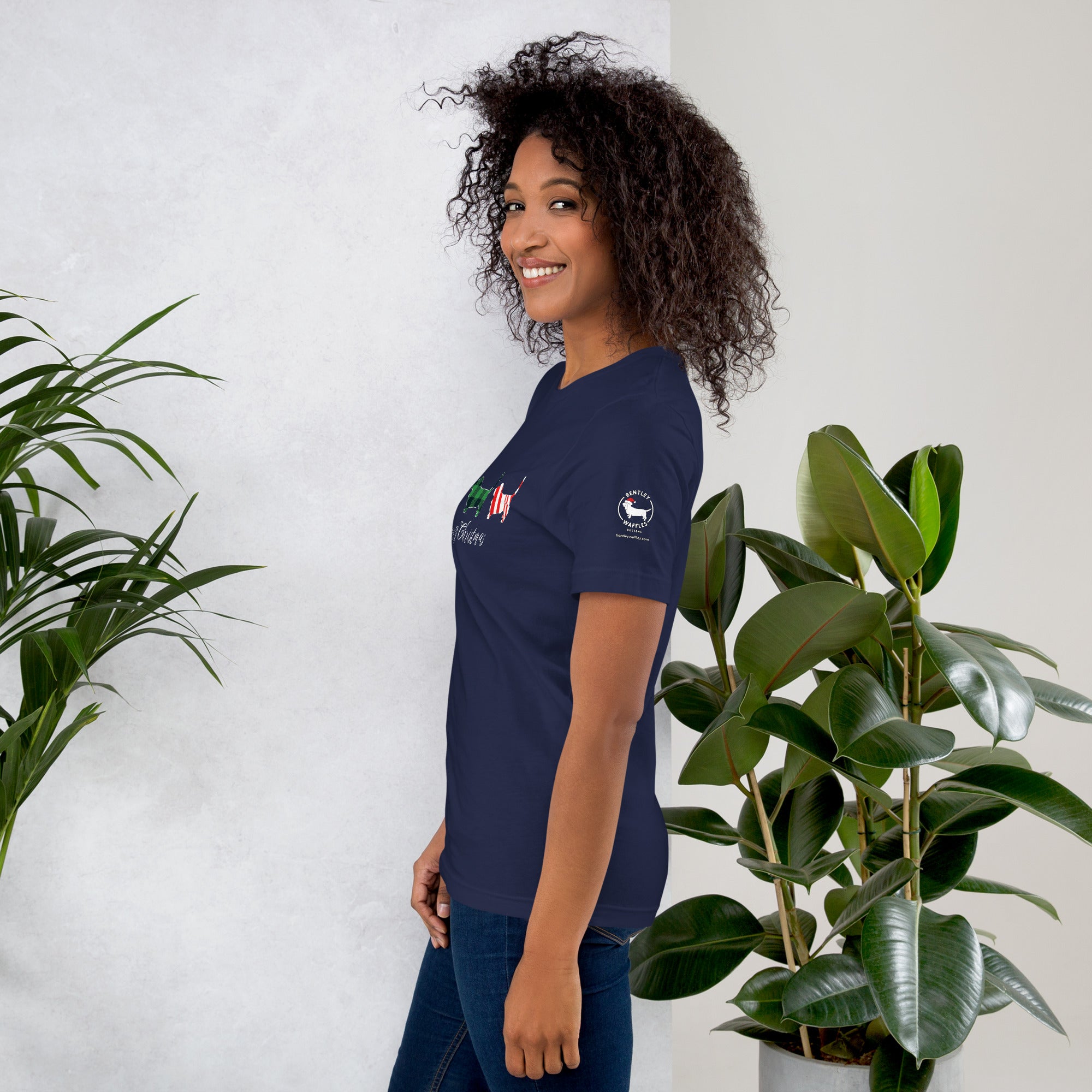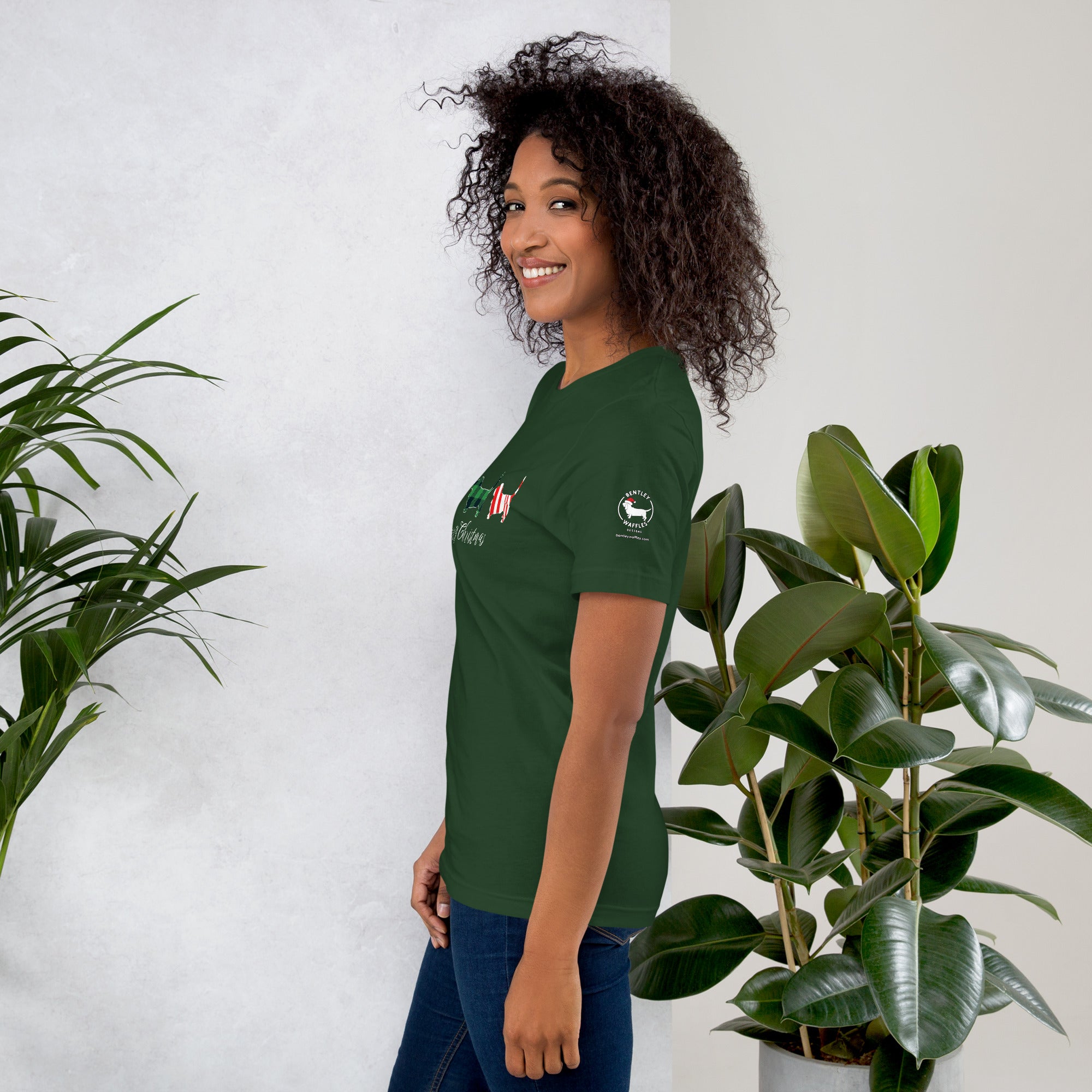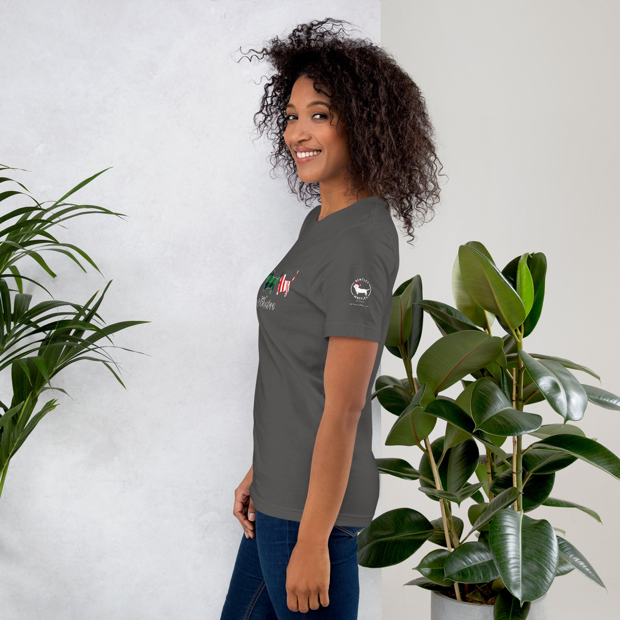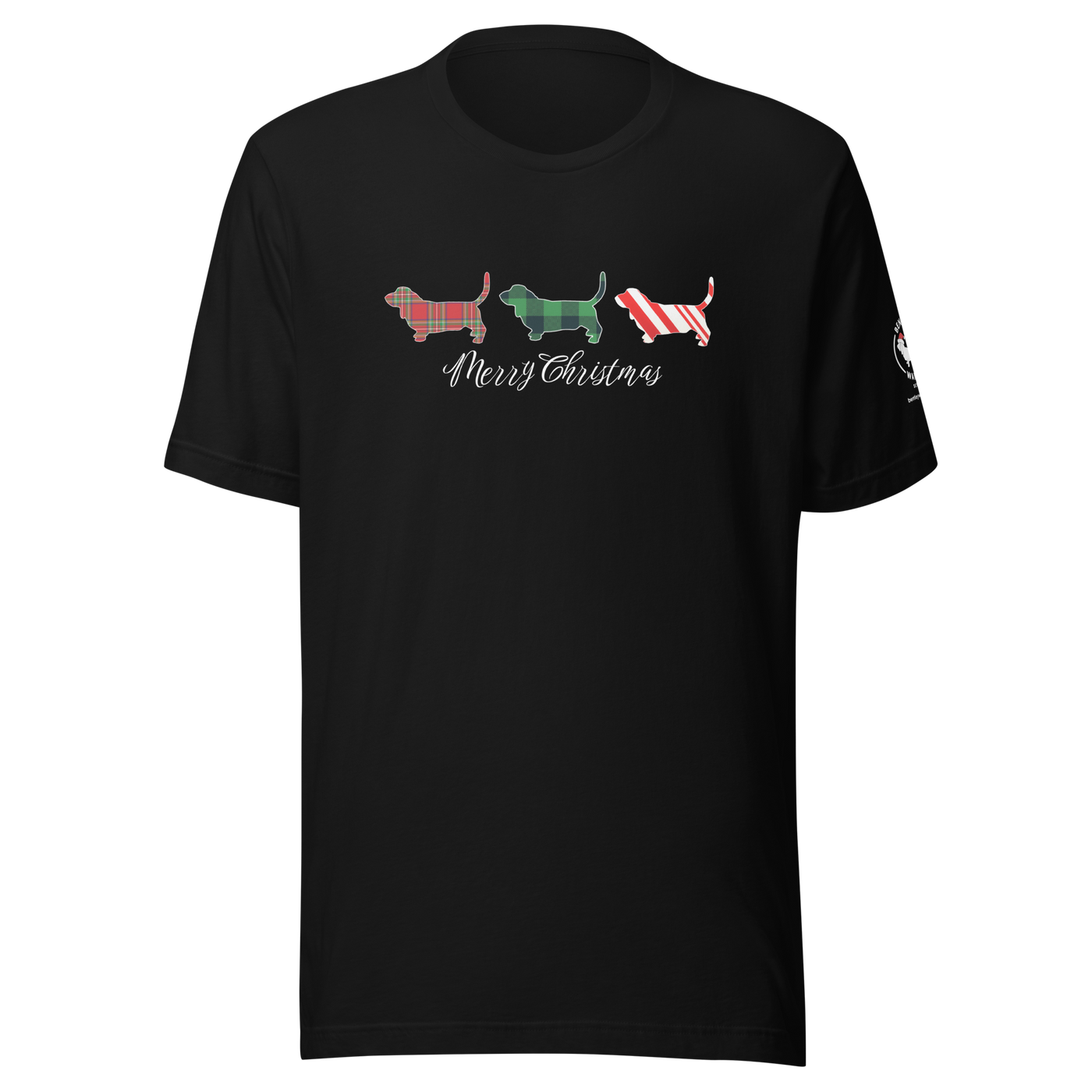 Introducing our delightful soft and lightweight T-shirt, designed with just the right amount of stretch for ultimate comfort. Featuring charming silhouettes of three adorable basset hounds, this festive shirt proudly declares "Merry Christmas" on the front. Perfect for lounging around the house or making a stylish statement at Christmas parties, it's a must-have addition to your holiday wardrobe. Get yours today and spread some festive cheer!
