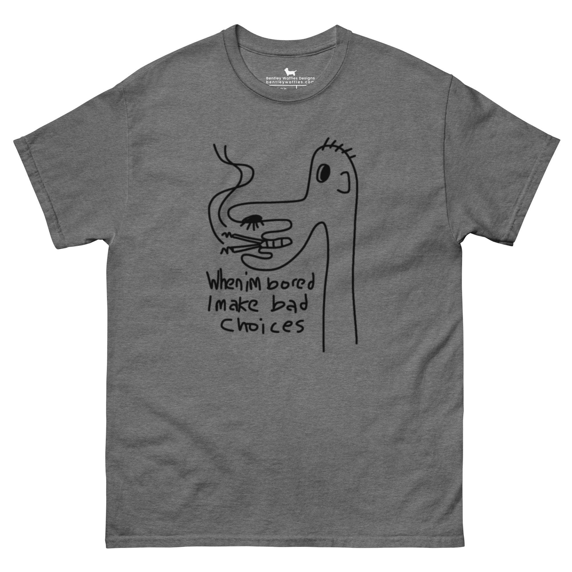 Presenting our hilariously sarcastic T-shirt featuring a hand-drawn image of a silly person smoking two cigarettes, paired with the cheeky phrase "When I'm bored I make bad choices." This shirt is a perfect pick for those who love to showcase their playful and irreverent sense of humor. Ideal for gifting or treating yourself, it embodies a crazy, carefree attitude that’s bound to turn heads and spark laughter.