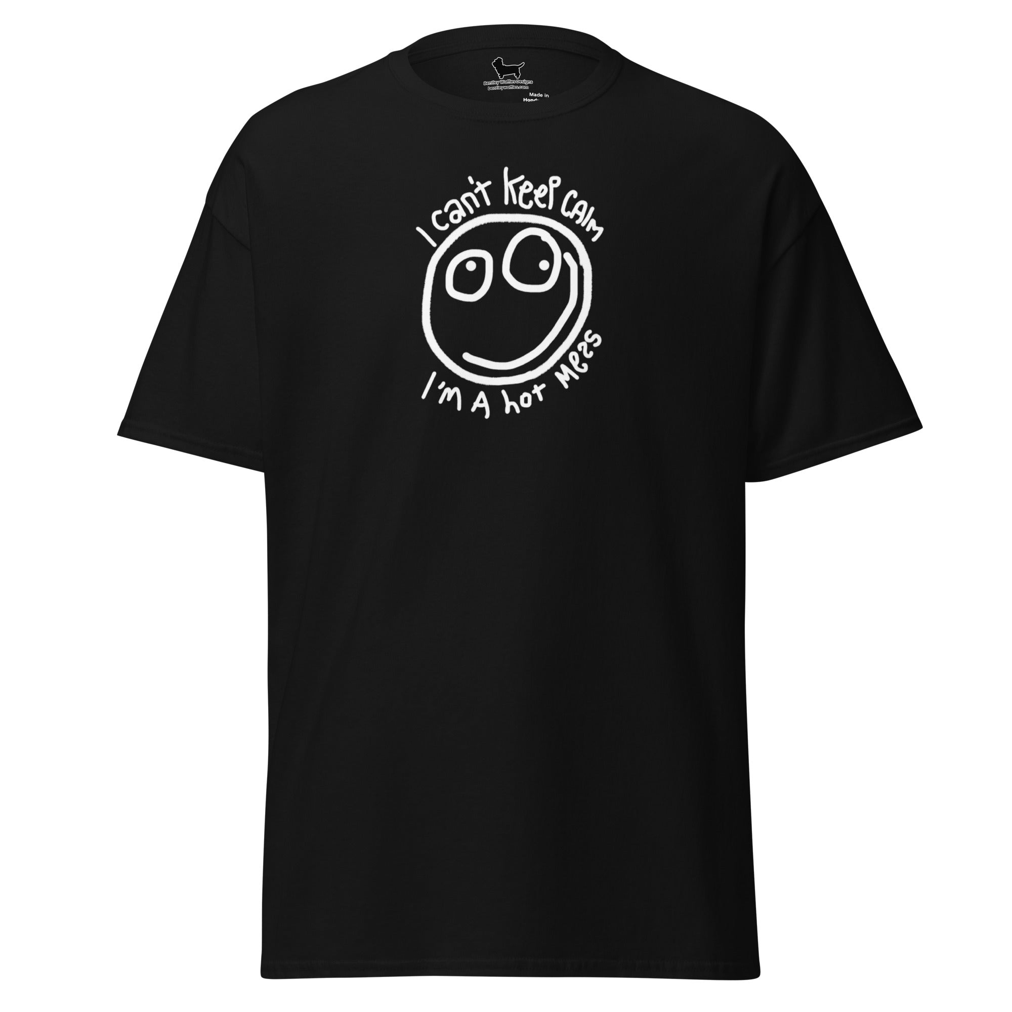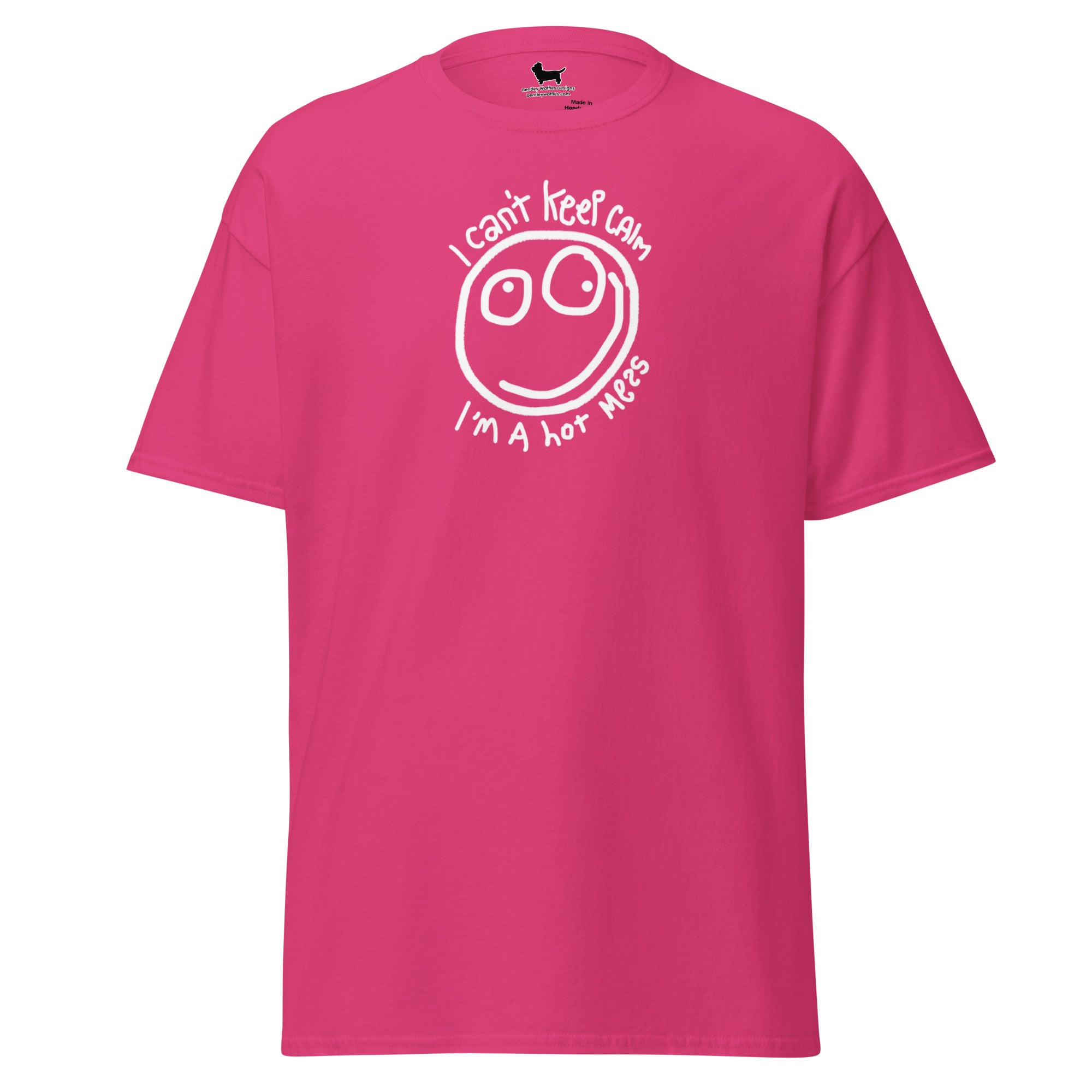 Welcome to our wear your feelings collection! Our "I Can't Keep Calm. I'm a Hot Mess" T-shirt features a playful, hand-drawn silly face that adds a touch of whimsy to your wardrobe. Perfectly crafted for comfort and style, this fun and lighthearted tee is designed to express your true emotions in a delightful way. Whether you’re lounging at home or out with friends, let your feelings shine through with this unique and comfy T-shirt. Embrace the mess and wear your heart on your shirt!