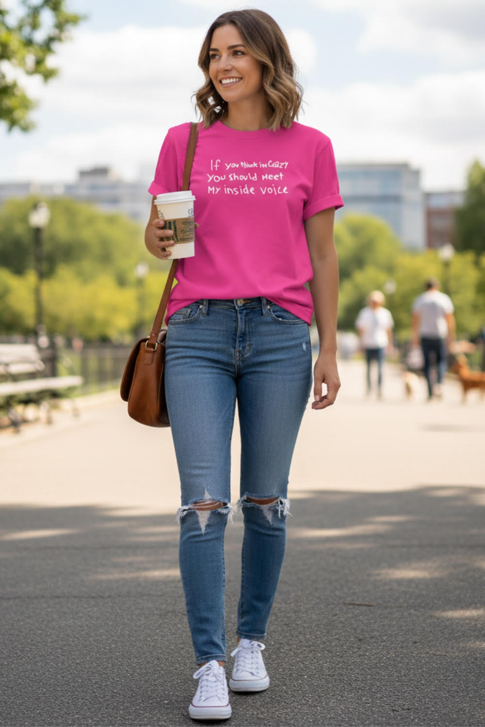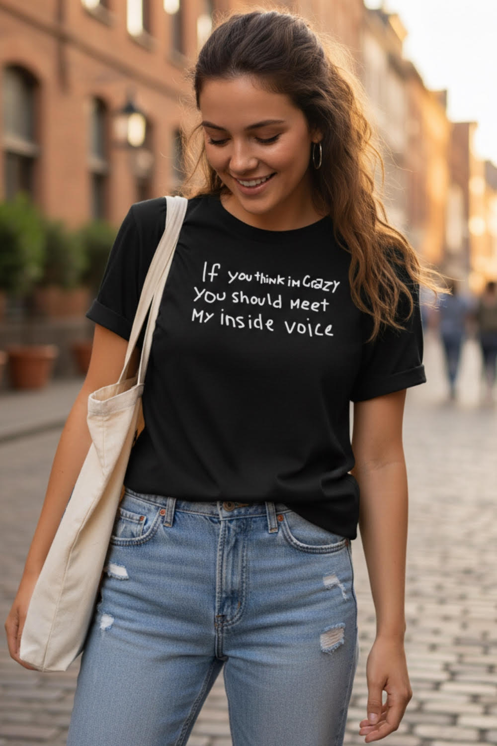 The "Wear Your Feelings" collection features a playful T-shirt that encourages self-expression with humor. The front of the shirt showcases the witty phrase, "If you think I'm crazy, you should meet my inside voice," inviting others to embrace their unique inner dialogues. Perfect for those who love to make a statement with whimsy and fun, this T-shirt is designed with comfort in mind, allowing you to wear your feelings wherever you go. Embrace your silly side and let your personality shine!