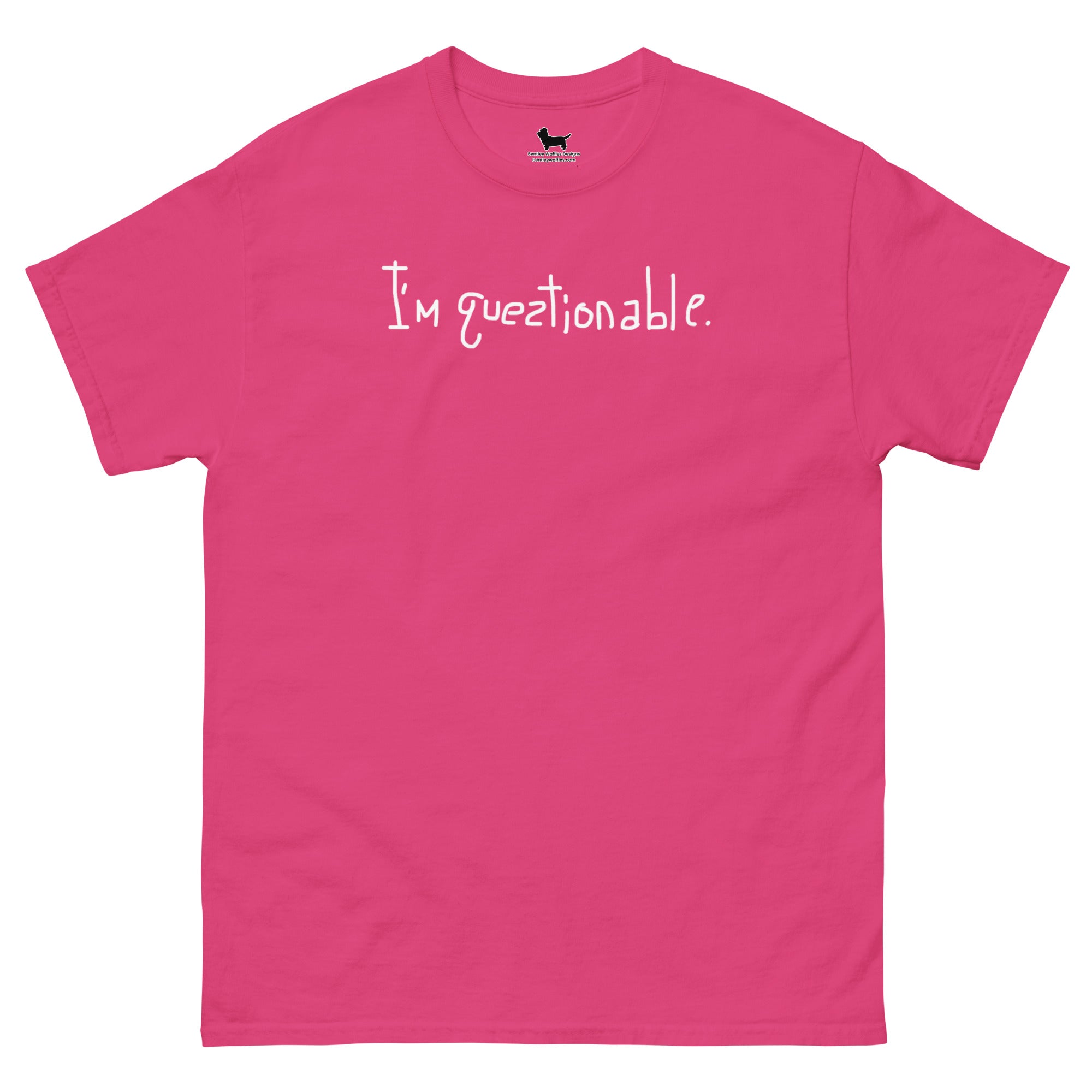 Introducing the "I'm Questionable" T-shirt from our "Wear Your Feelings" collection! This stylish and comfortable shirt boldly displays the phrase "I'm Questionable," allowing you to express your mood and attitude effortlessly. Perfect for those days when you feel a little ambiguous or just want to add a touch of humor to your wardrobe, this T-shirt invites others to join in on the fun. Made for comfort and style, it’s the ideal choice for any casual occasion. Embrace your unique vibe and let everyone know how you feel by wearing your feelings right on your shirt!