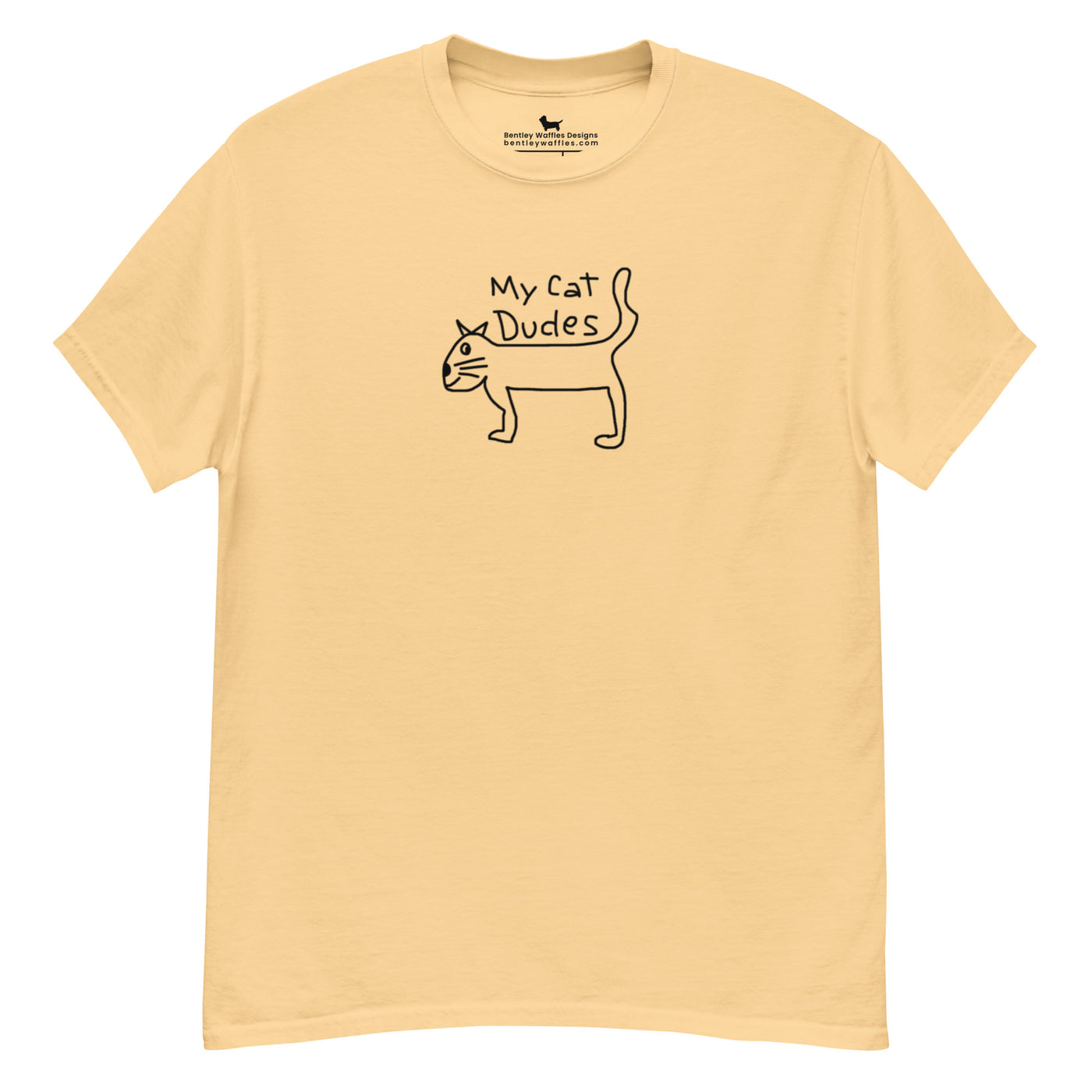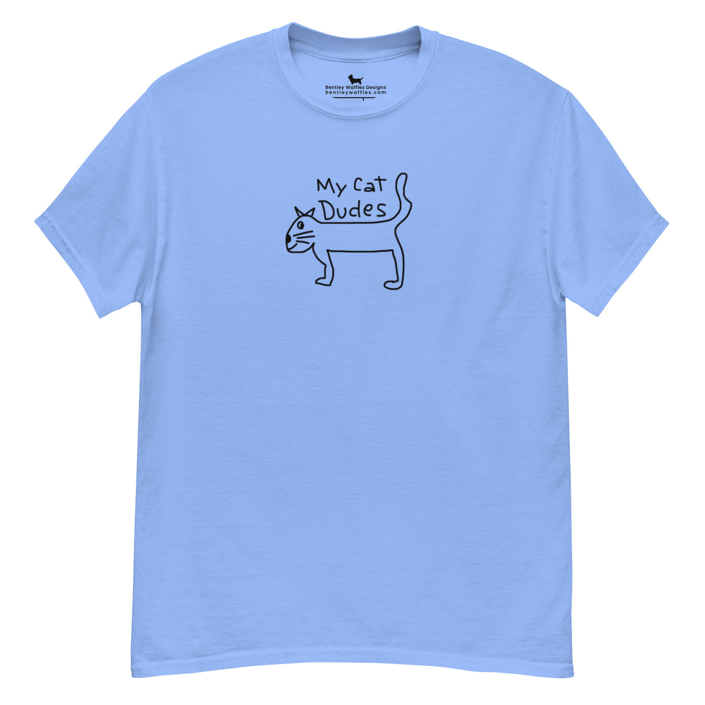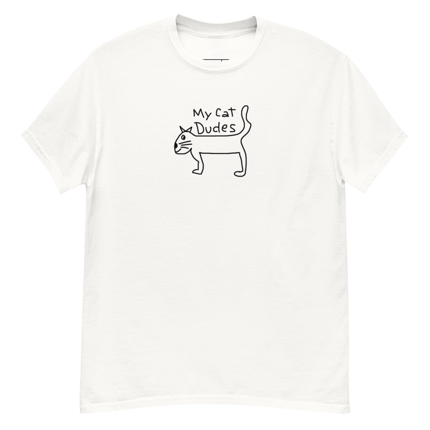 Introducing our T-shirt featuring a whimsical hand-drawn design of an ultra-cool cat! This playful T-shirt boasts the phrase "My Cat Dudes," celebrating the feline's laid-back vibe and undeniable charm. Perfect for any casual outfit, this shirt is designed for those who love to express their fun-loving spirit and show off their affection for their furry friends. Wear it with pride and let the world know that you're a proud cat parent! Get yours today and add a touch of whimsy to your wardrobe.