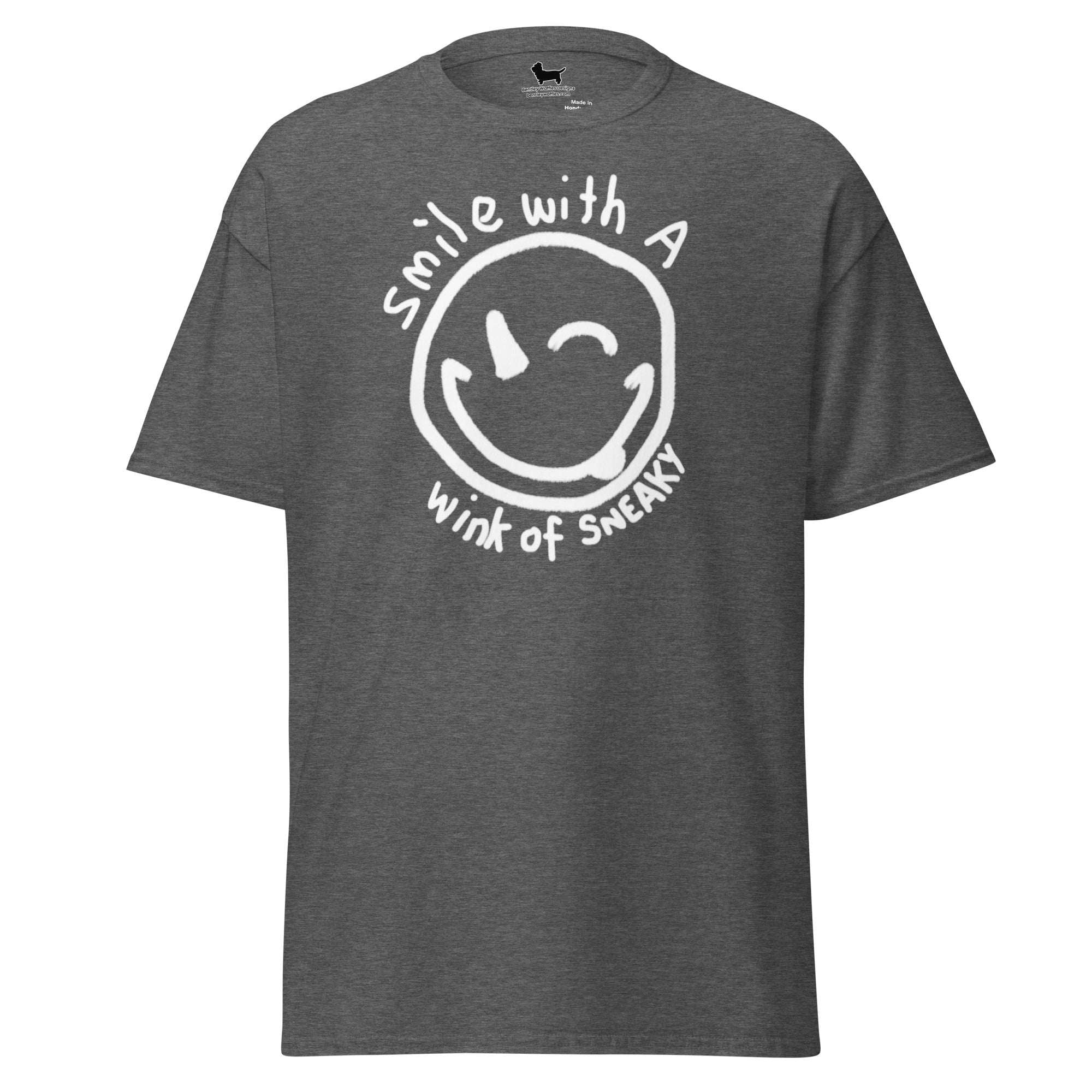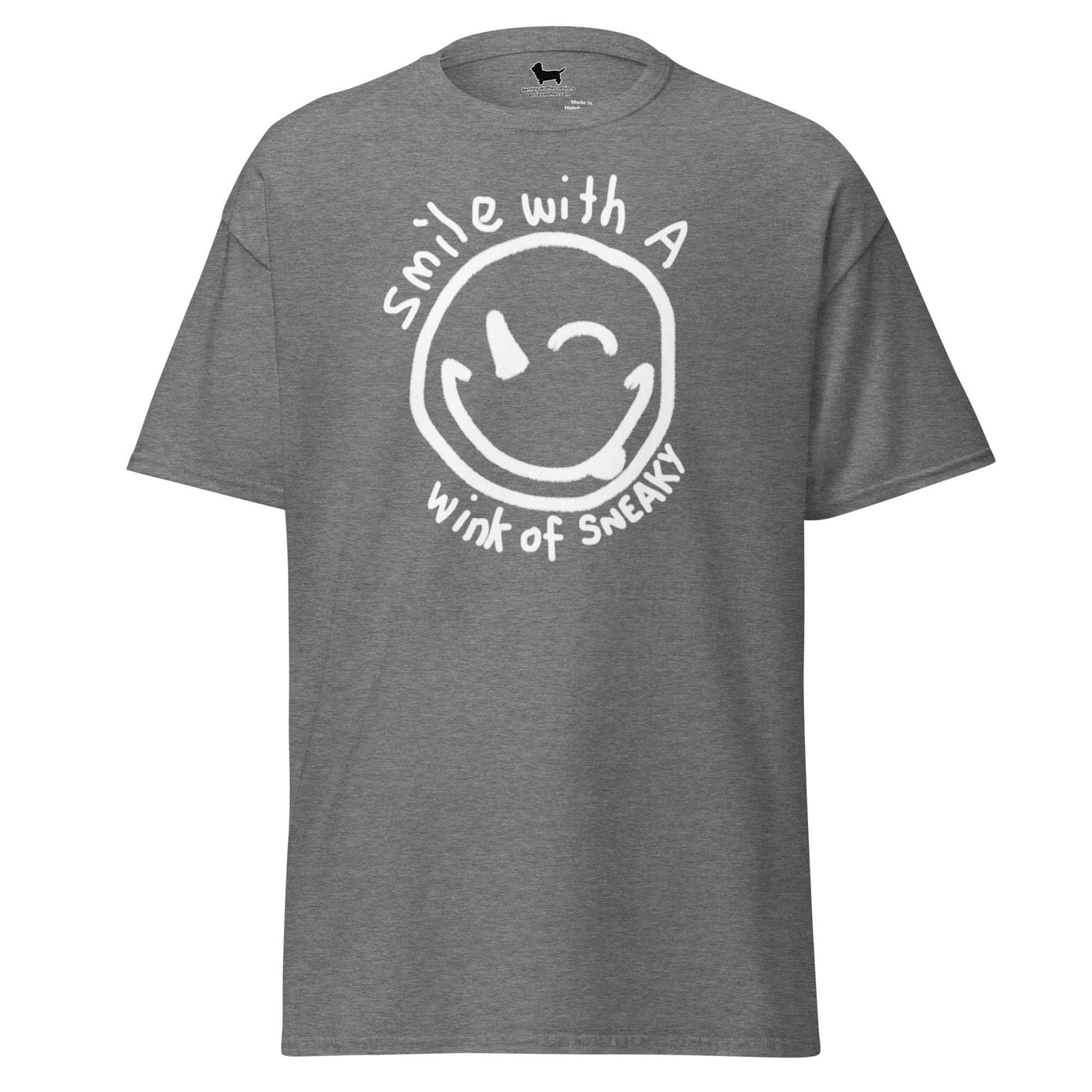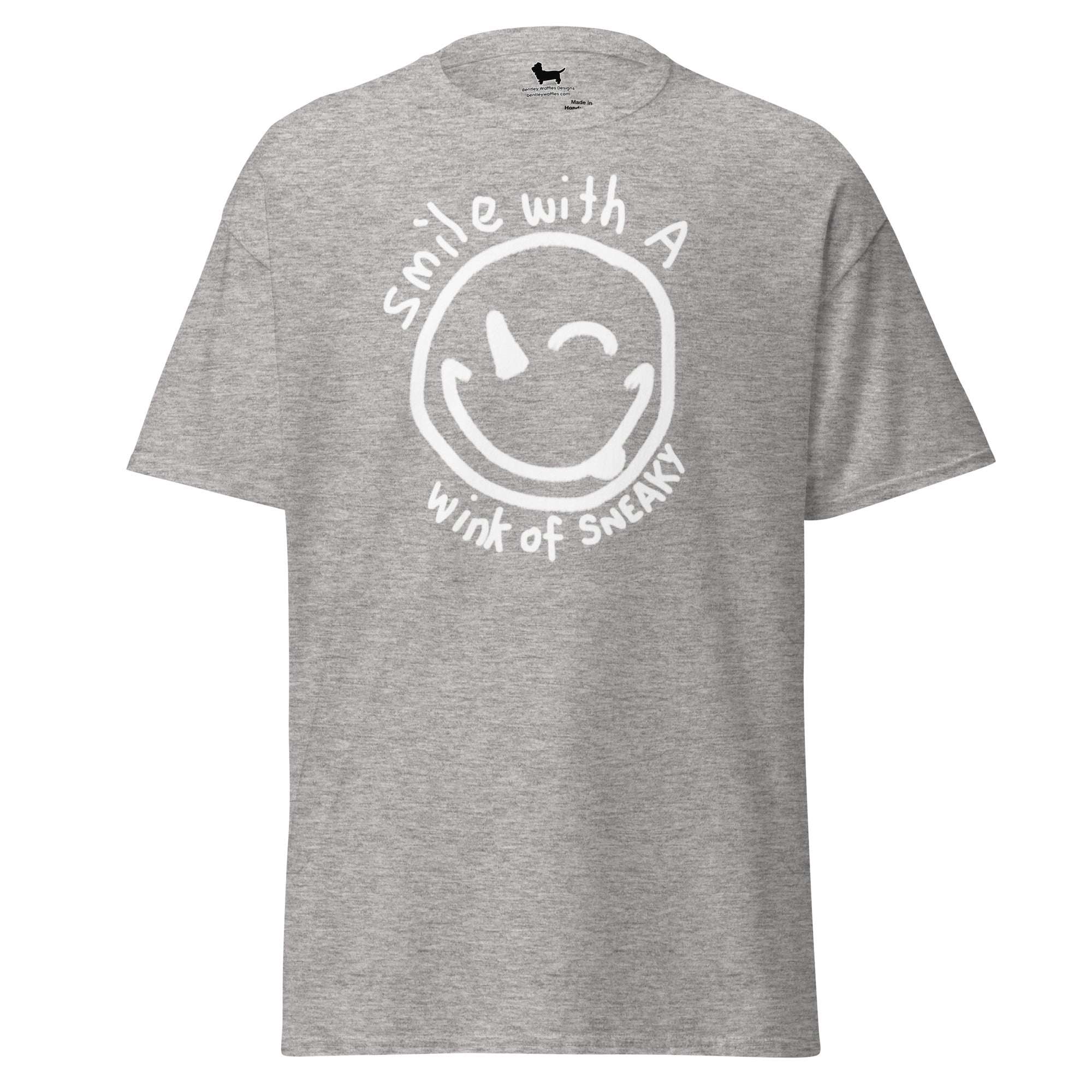 This versatile tee features a charming hand-drawn smiley face with a cheeky wink, surrounded by the playful phrase "Smile with a wink of sneaky." Embrace your mischievous side and show off your unique personality with this fun and stylish T-shirt. Perfect for any occasion, it's a must-have addition to your wardrobe. Get ready to turn heads and spread positivity wherever you go!