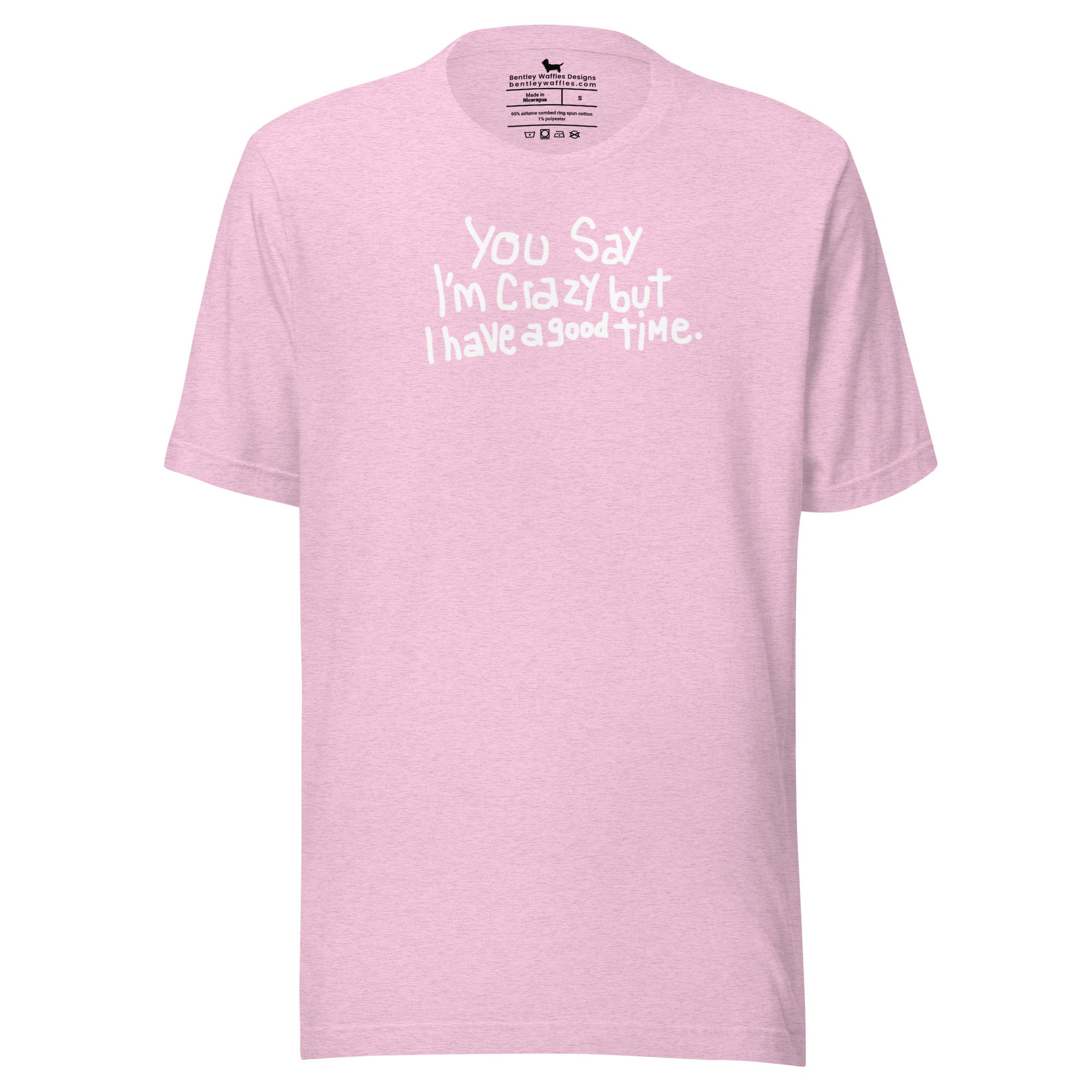 Elevate your wardrobe with our "You Say I'm Crazy, But I Have a Good Time" T-shirt! This fun and playful shirt is perfect for those who know how to embrace life and enjoy every moment. Made from soft, lightweight fabric, it feels comfortable against your skin and is versatile enough to wear anywhere—whether you're out with friends, lounging at home, or exploring new adventures. With its catchy slogan, this T-shirt not only makes a statement but also adds a bit of humor to your everyday outfit. Get ready to show off your fun-loving spirit!