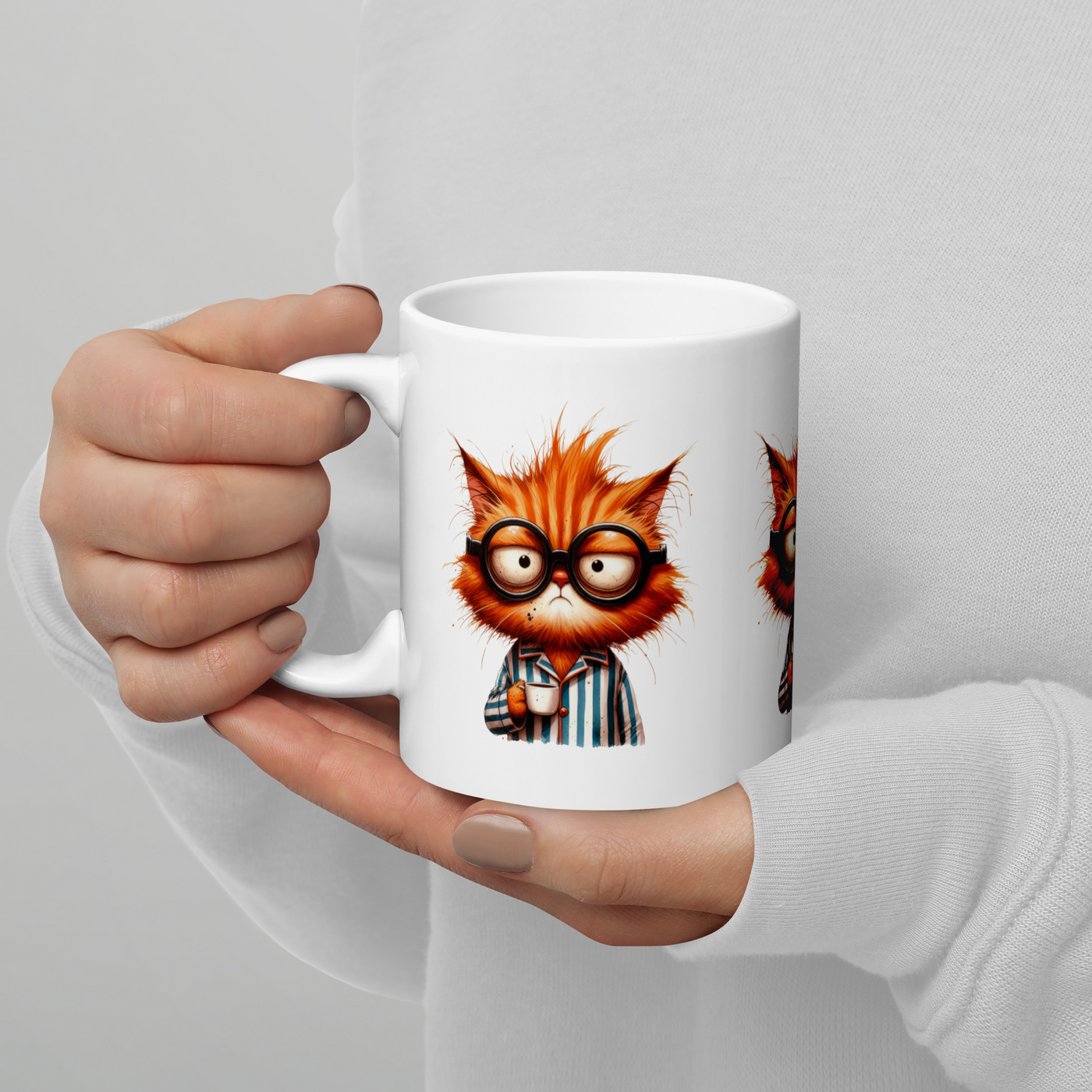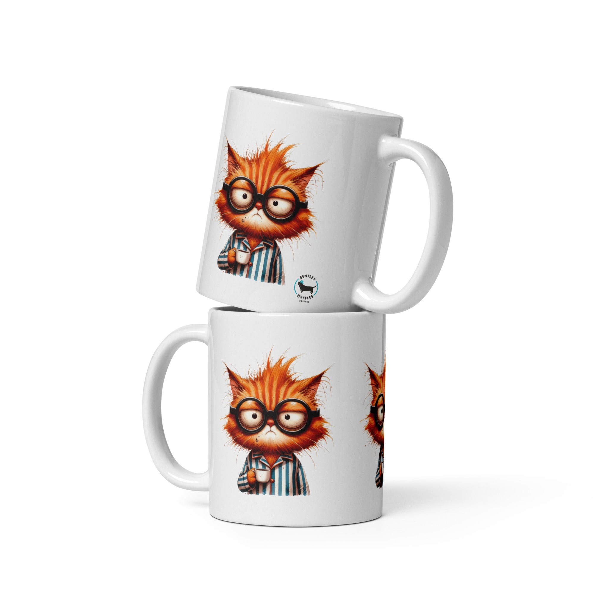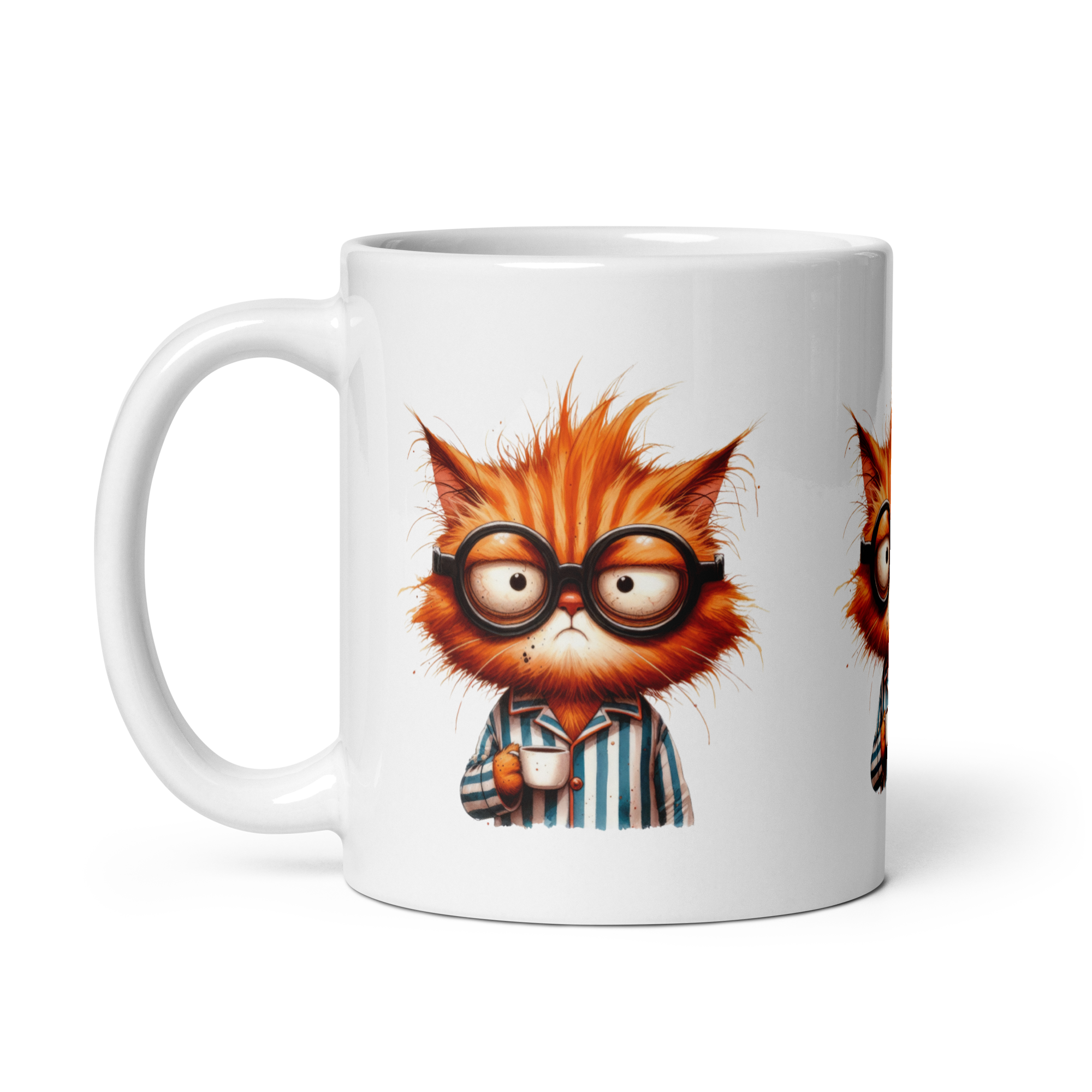 Introducing our delightful 11-ounce ceramic mug, designed for cat lovers and coffee enthusiasts alike! This charming mug features a printed image of an adorable sleepy orange cat wearing glasses, beautifully showcased on three sides. Perfectly crafted for your morning coffee, afternoon tea, or any beverage you desire, it’s microwave and dishwasher safe for added convenience. This fun and unique mug will surely brighten your day, making it an ideal gift for friends, family, or yourself. Whether you're starting your day or enjoying a cozy evening, let this sleepy cat bring a smile to your face every time you take a sip!