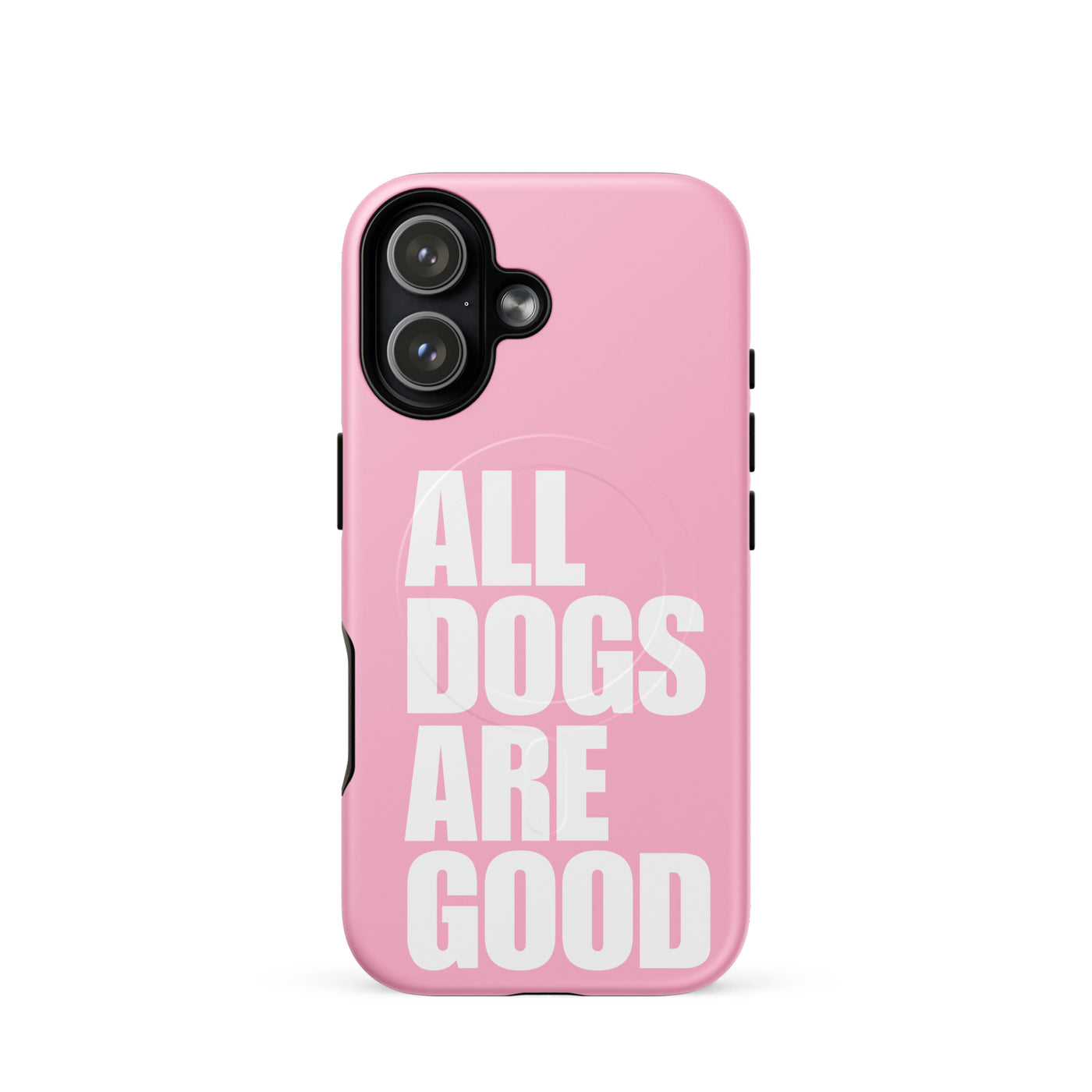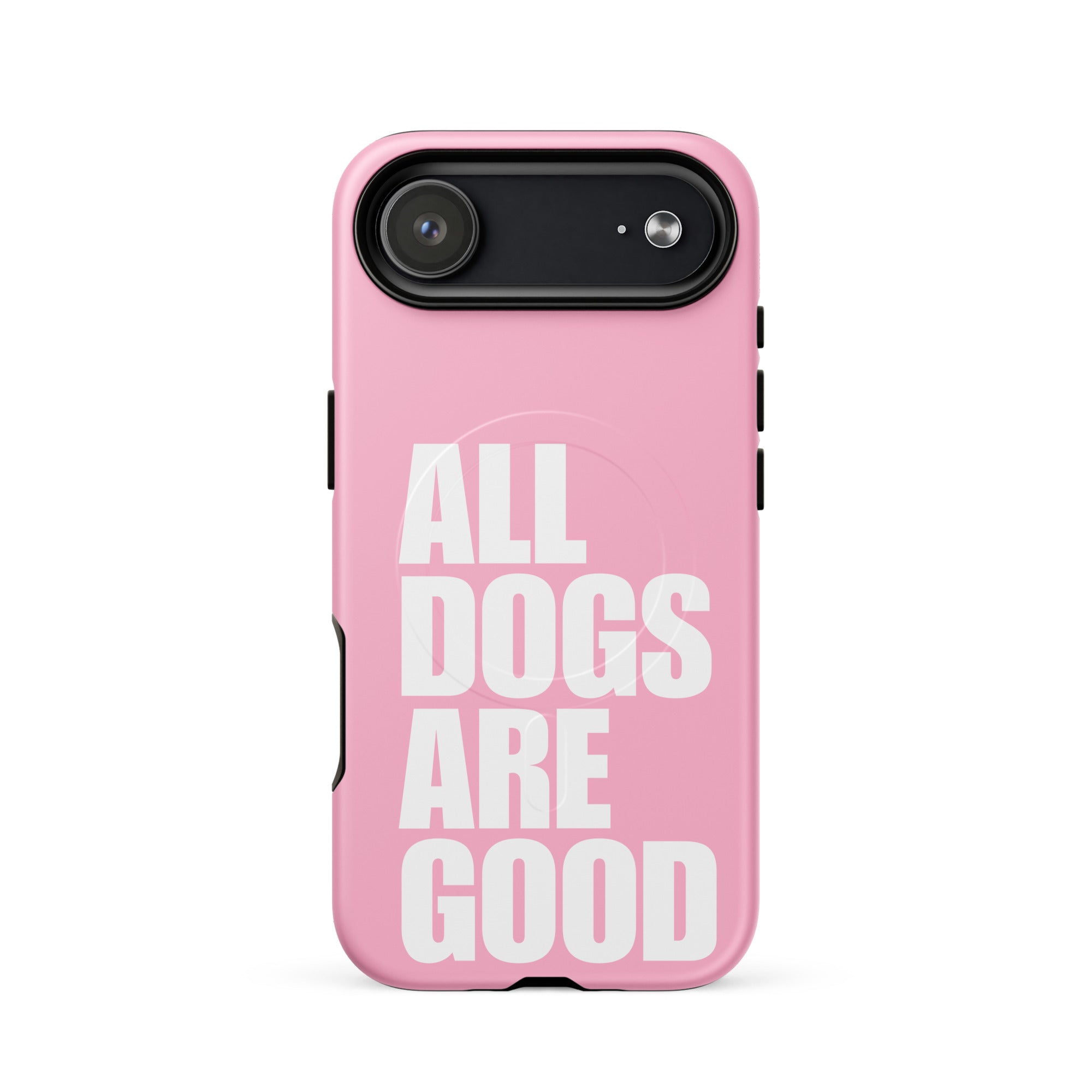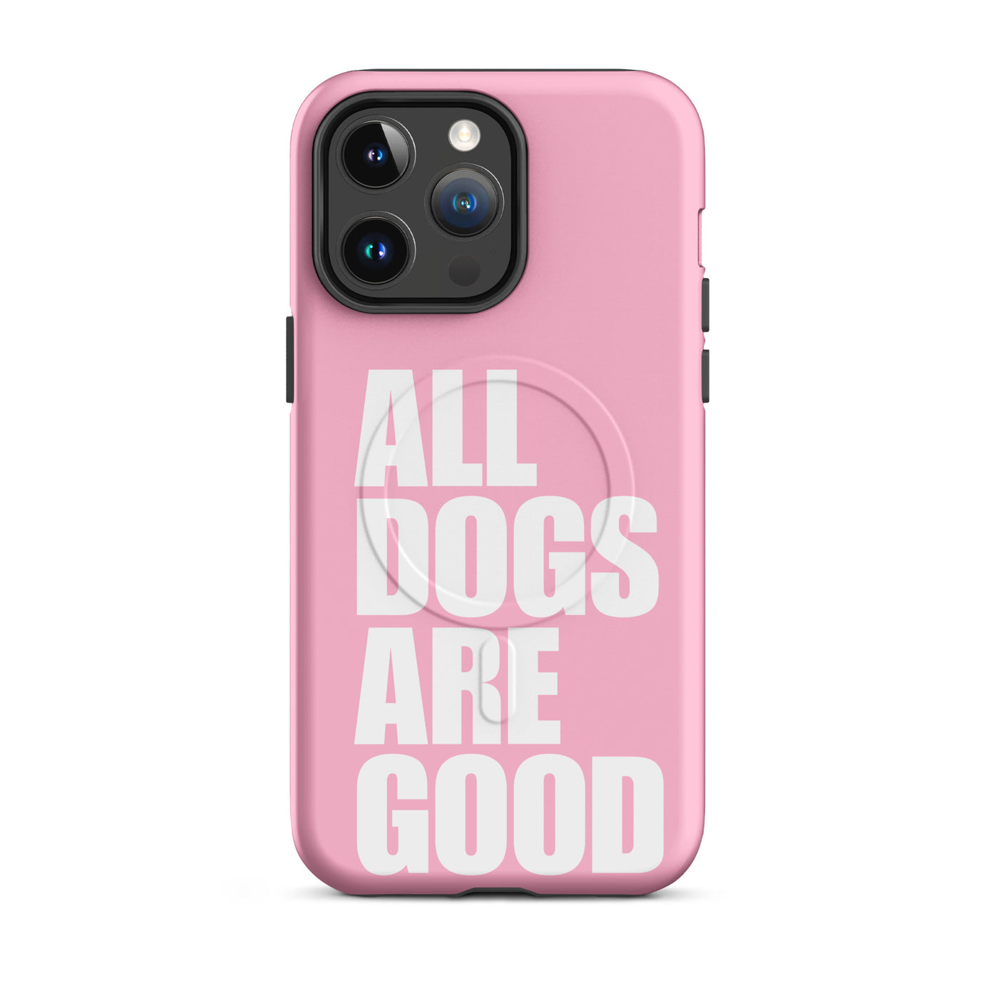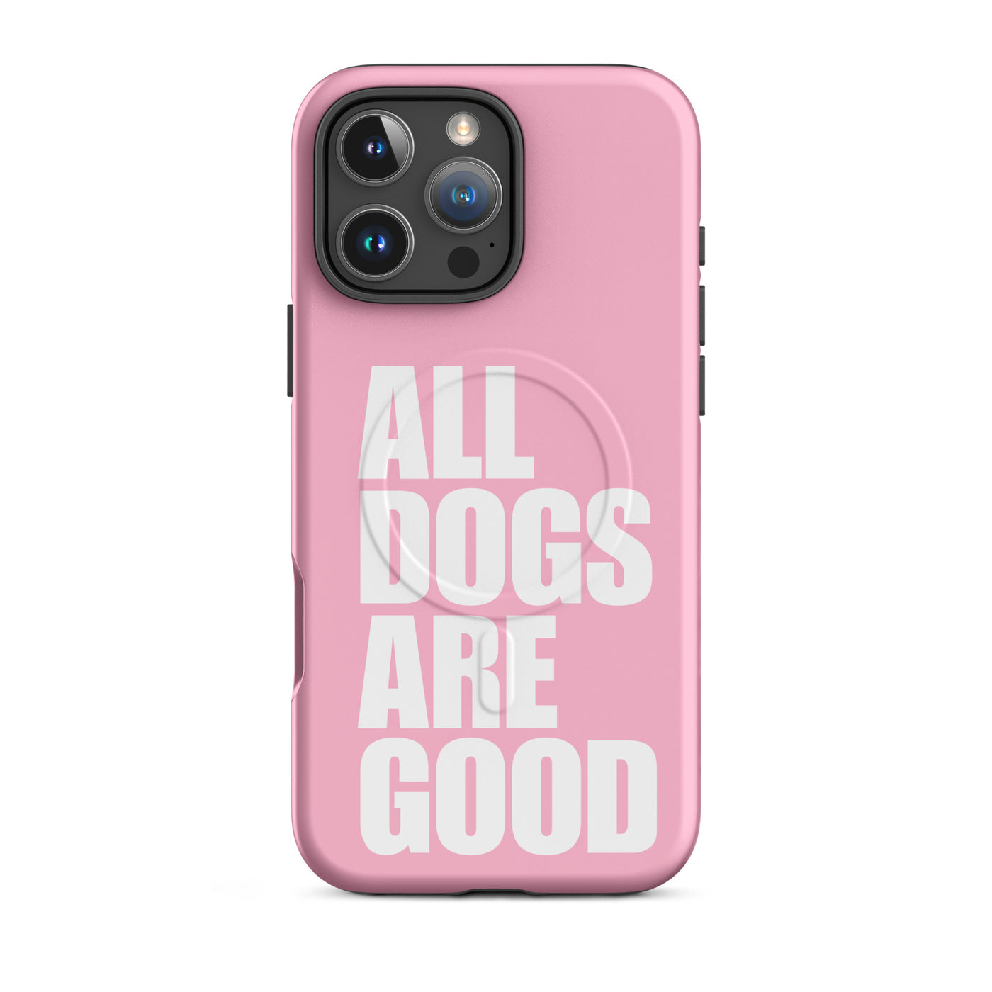 Protect your iPhone in style with the All Dogs Are Good MagSafe Tough Case, featuring a vibrant pink cotton candy design with bold white lettering. This dual-layer case combines an impact-resistant shell with a shock-absorbing liner to keep your device safe from drops, bumps, and everyday wear. Show off your love for the cool dog life with this eye-catching protective case that doesn't compromise on durability or magnetic strength.