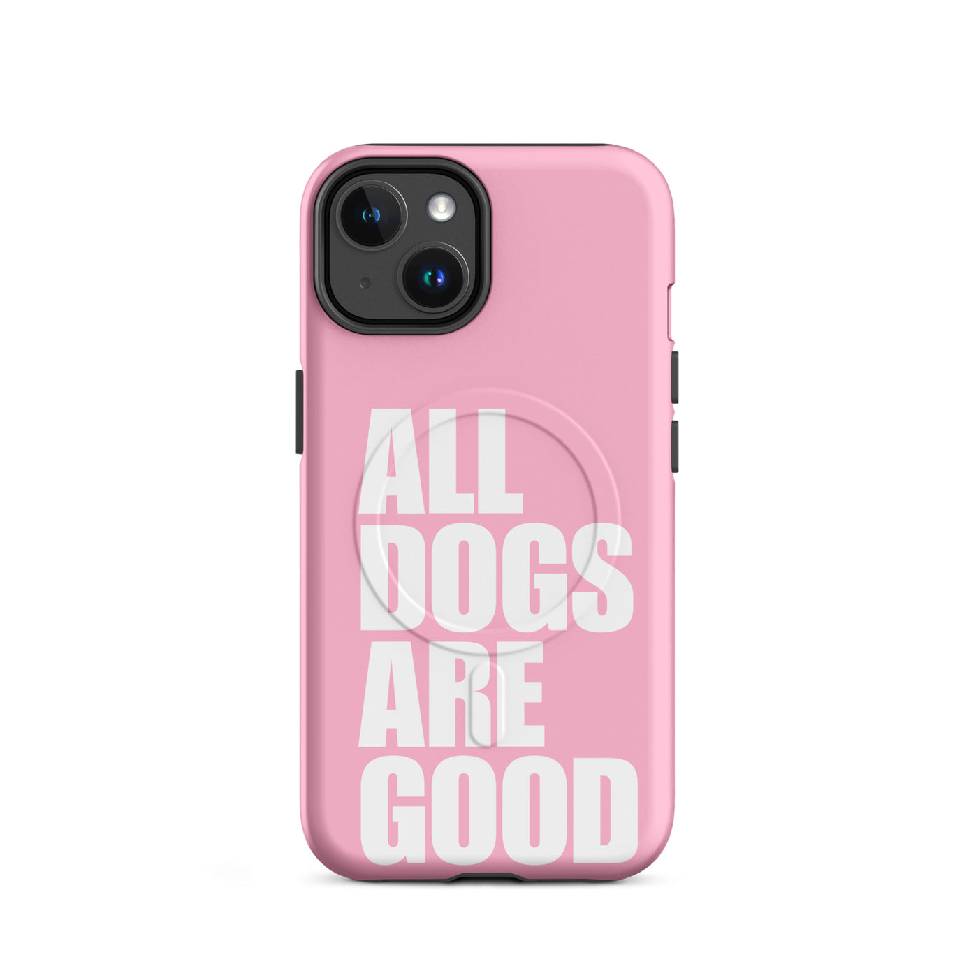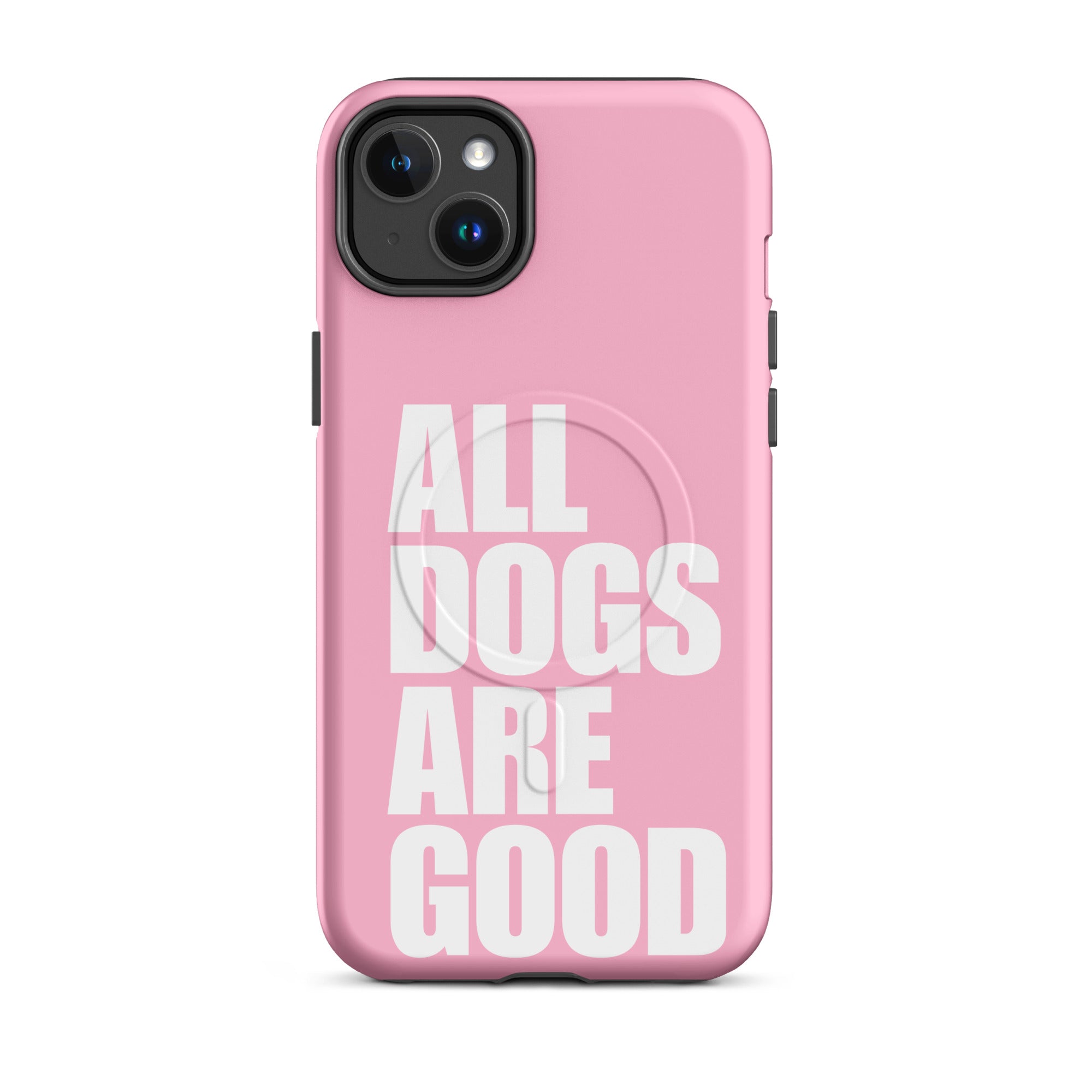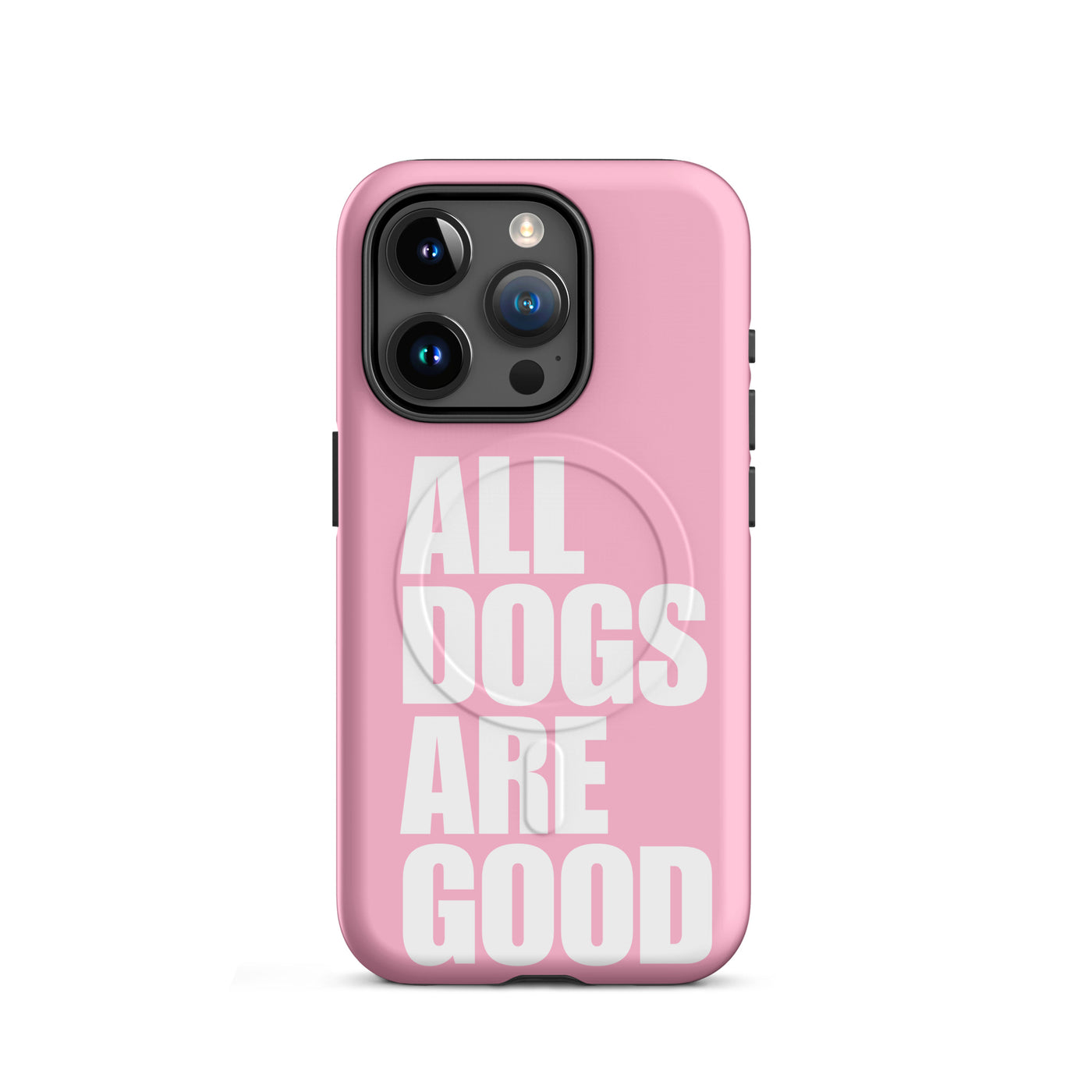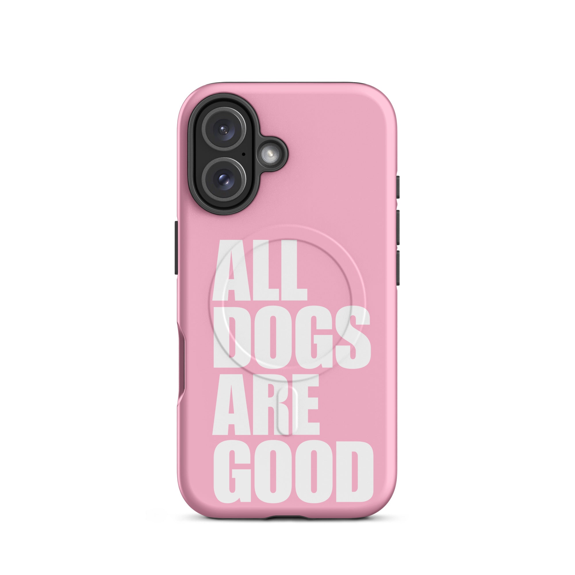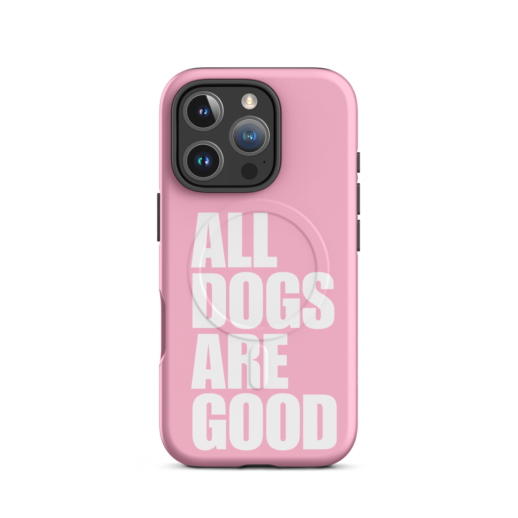 Protect your iPhone in style with the All Dogs Are Good MagSafe Tough Case, featuring a vibrant pink cotton candy design with bold white lettering. This dual-layer case combines an impact-resistant shell with a shock-absorbing liner to keep your device safe from drops, bumps, and everyday wear. Show off your love for the cool dog life with this eye-catching protective case that doesn't compromise on durability or magnetic strength.