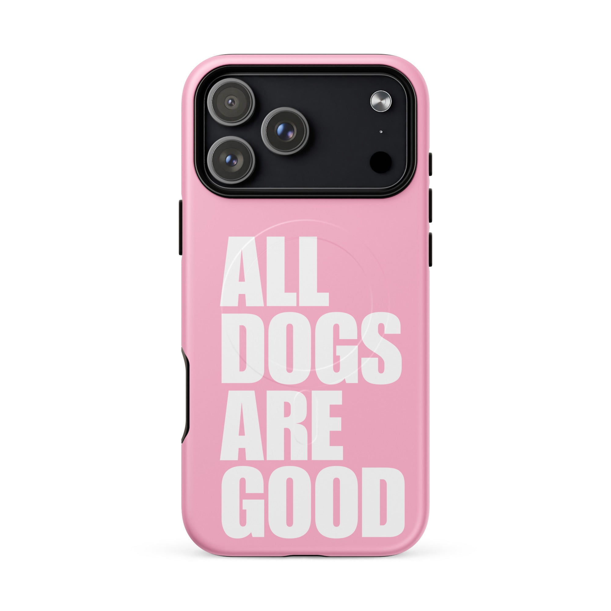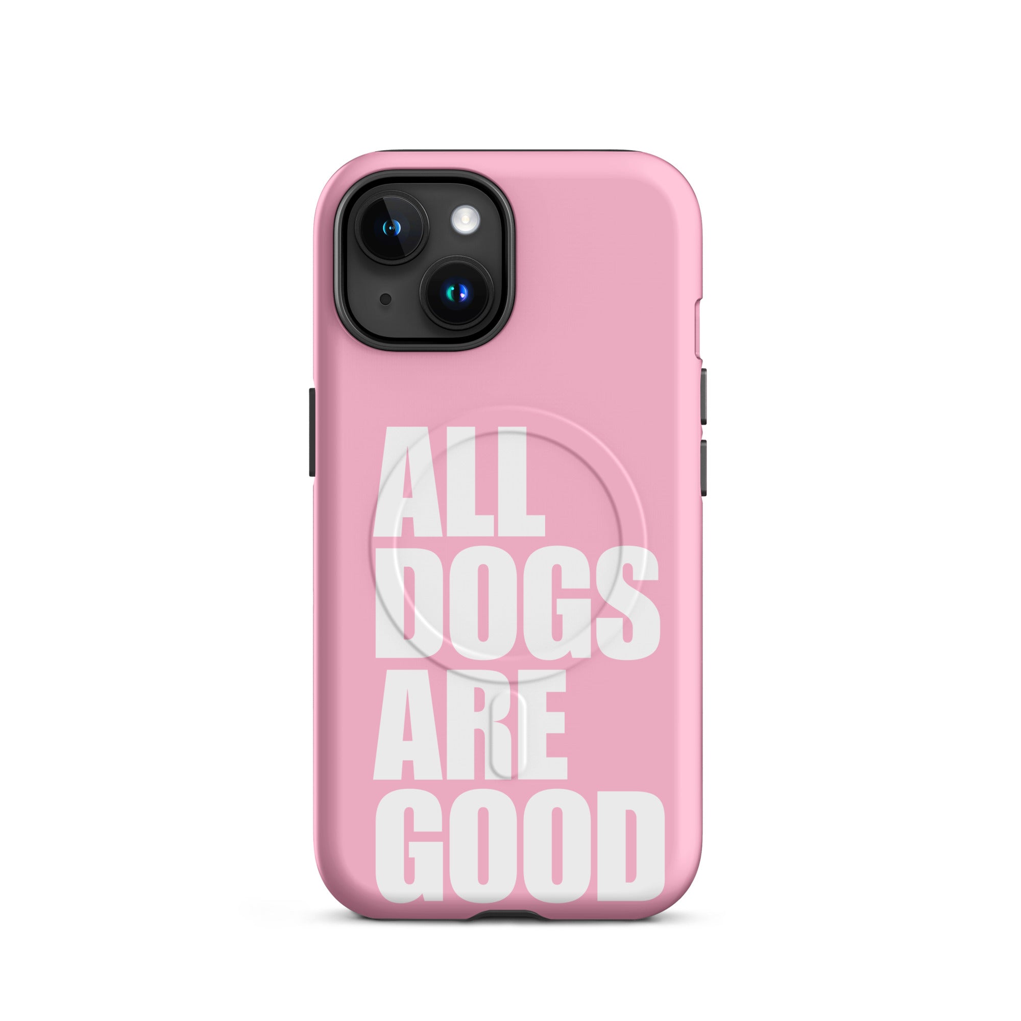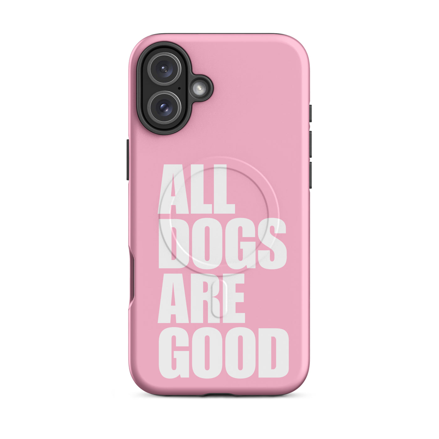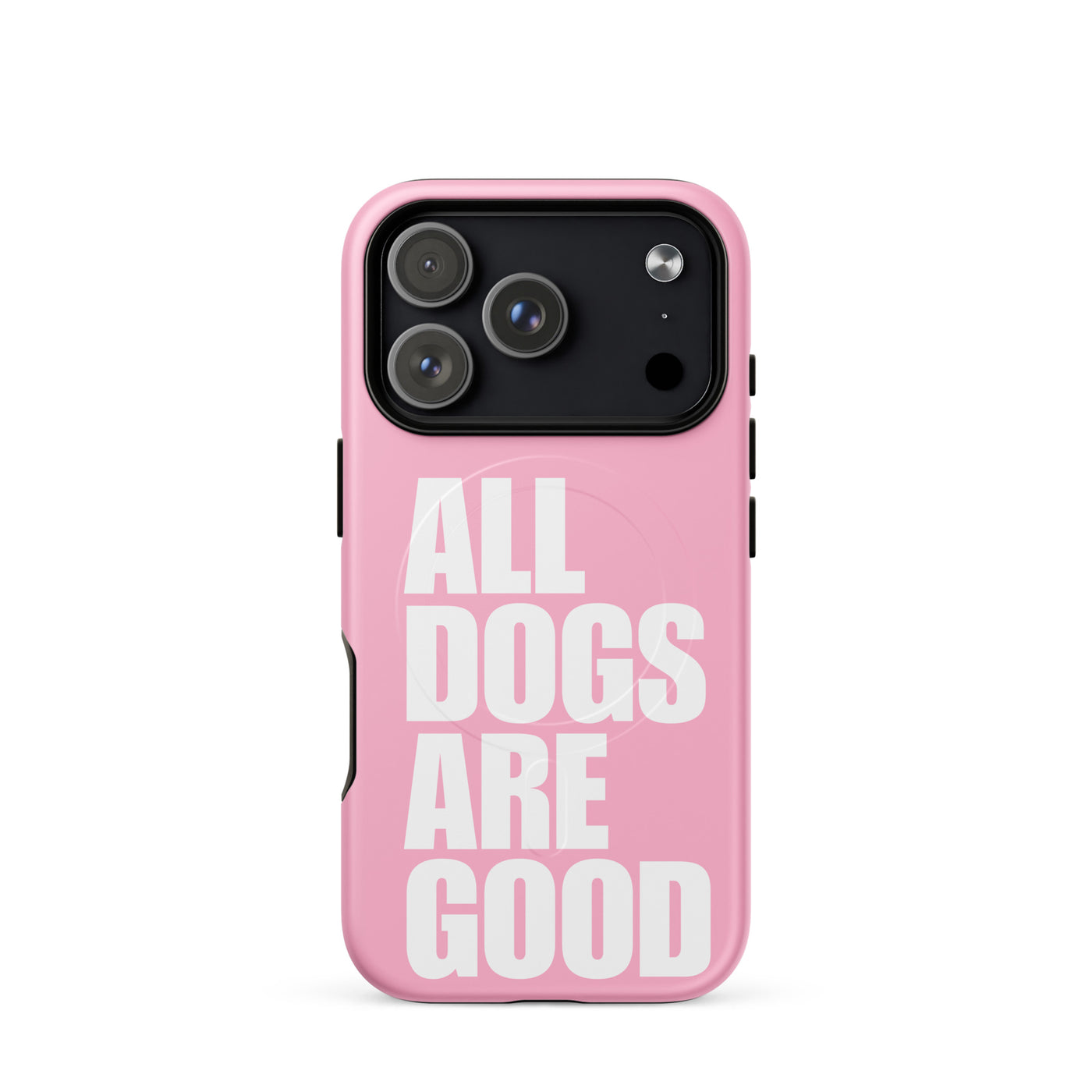 Protect your iPhone in style with the All Dogs Are Good MagSafe Tough Case, featuring a vibrant pink cotton candy design with bold white lettering. This dual-layer case combines an impact-resistant shell with a shock-absorbing liner to keep your device safe from drops, bumps, and everyday wear. Show off your love for the cool dog life with this eye-catching protective case that doesn't compromise on durability or magnetic strength.