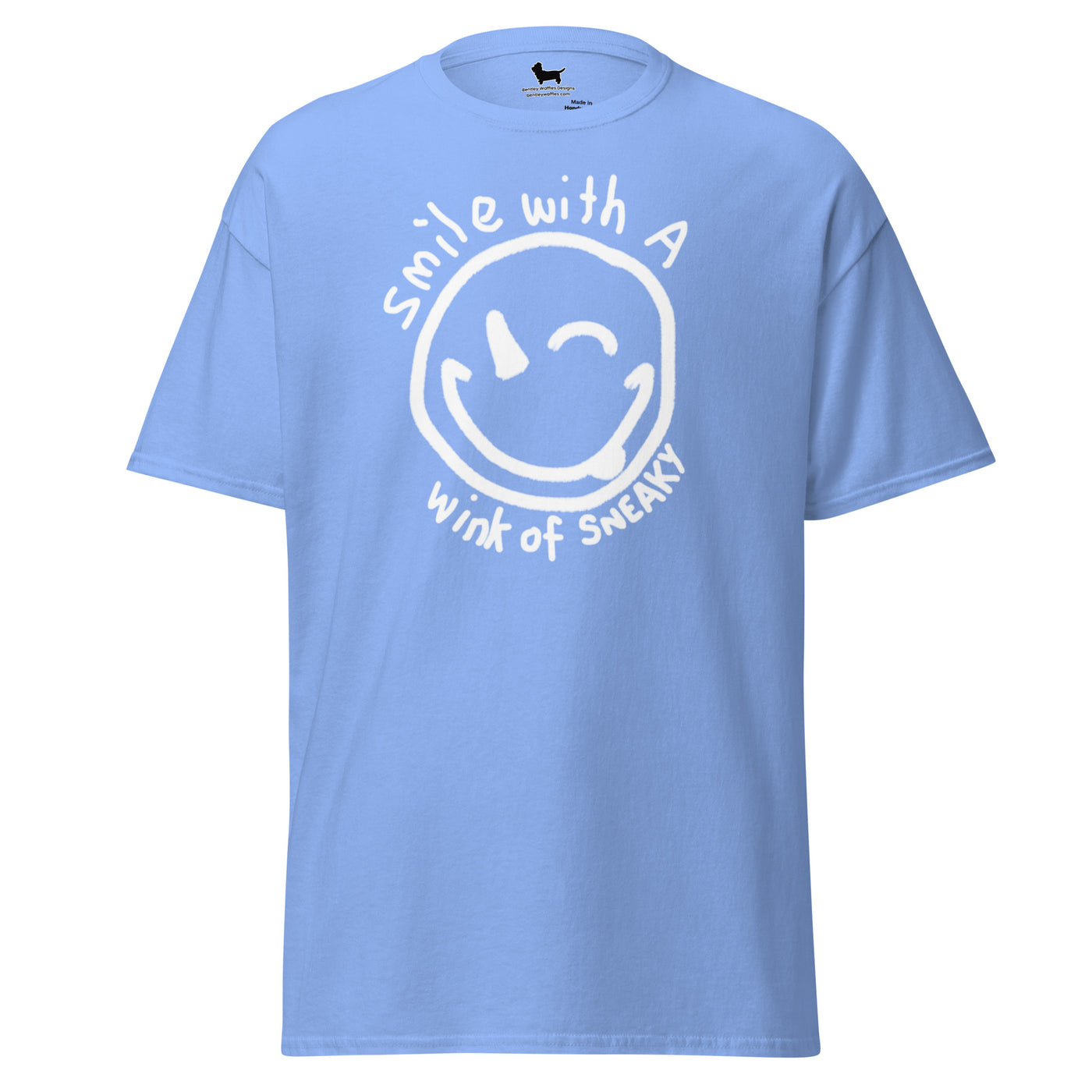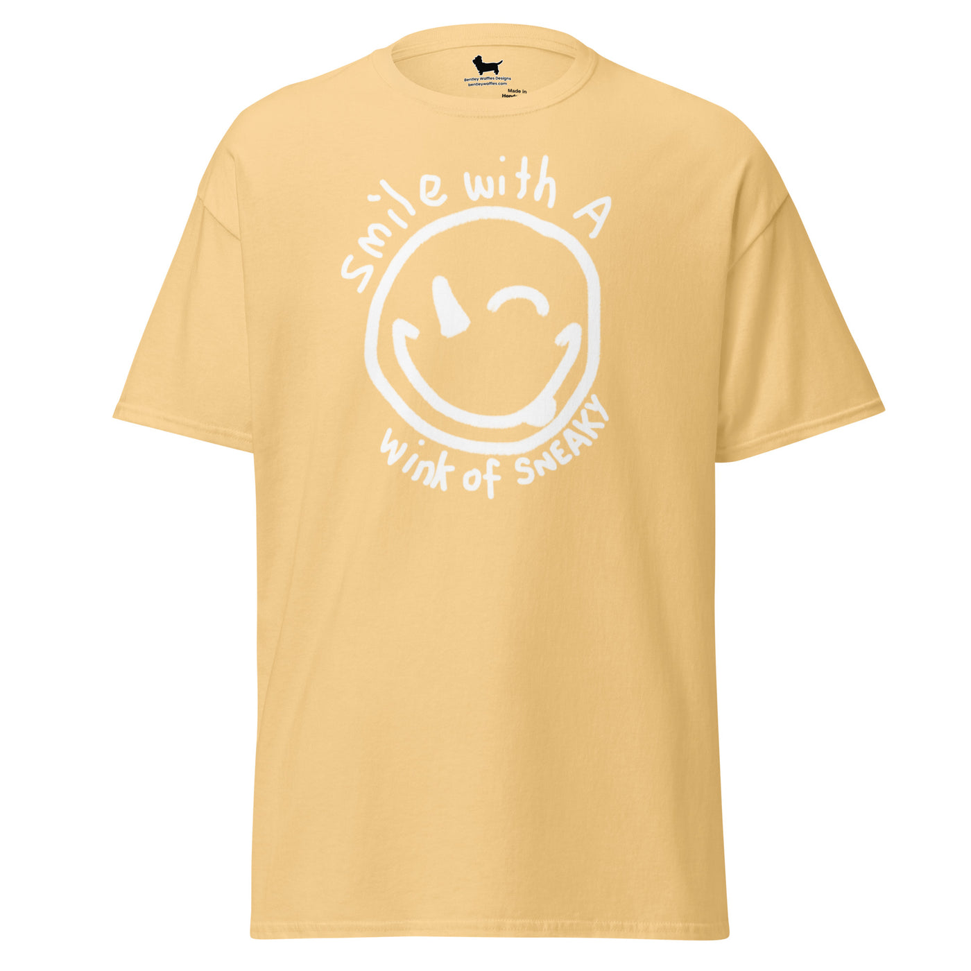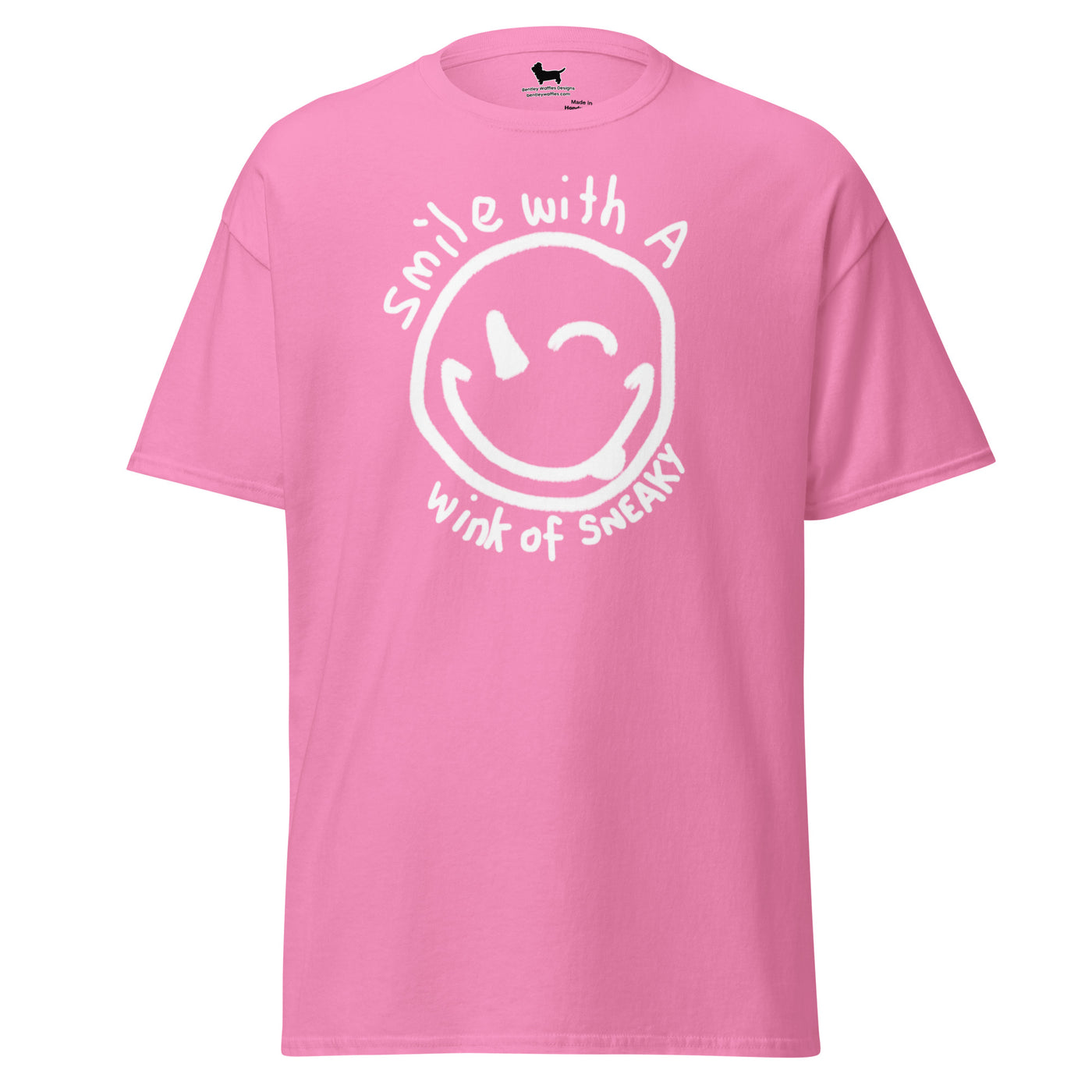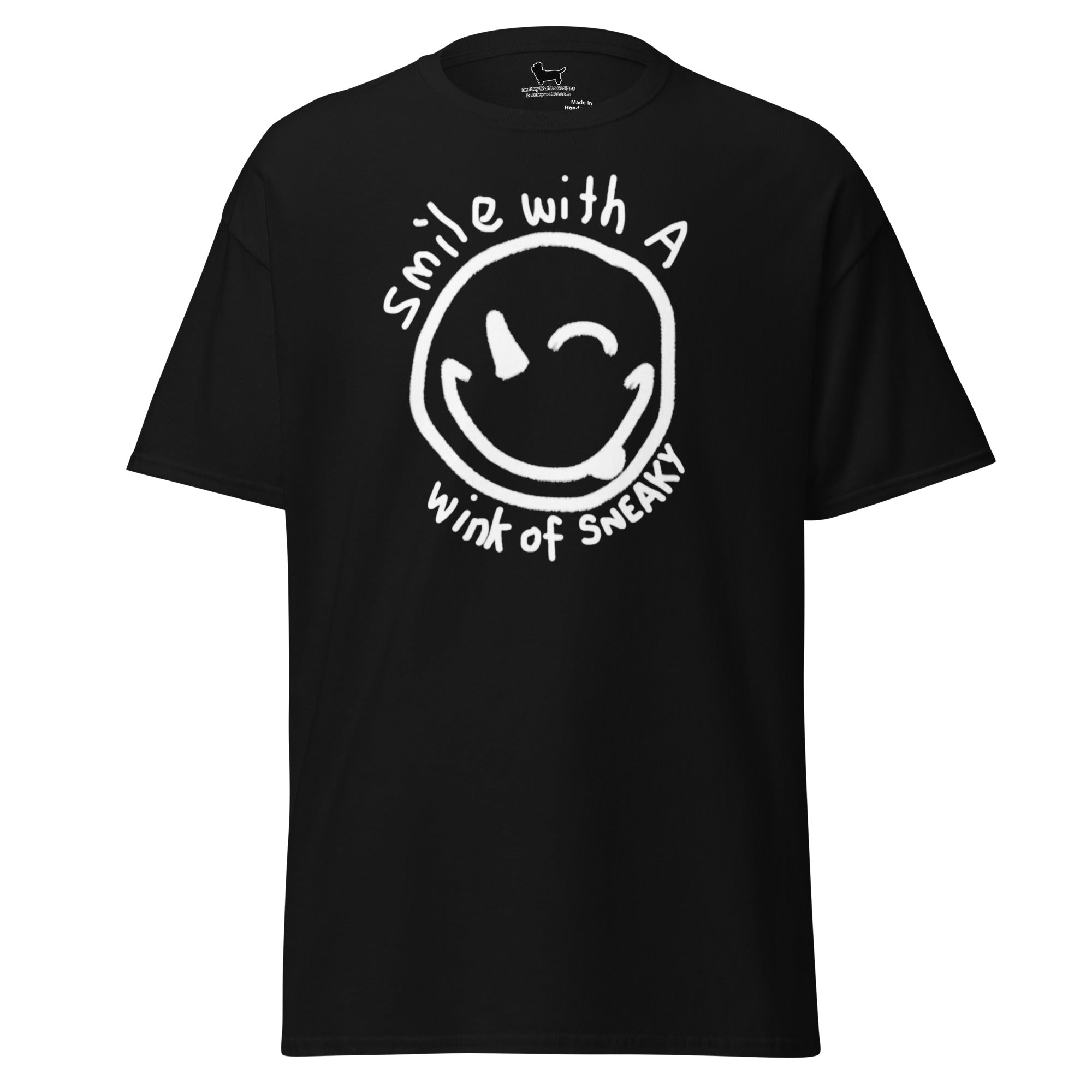This versatile tee features a charming hand-drawn smiley face with a cheeky wink, surrounded by the playful phrase "Smile with a wink of sneaky." Embrace your mischievous side and show off your unique personality with this fun and stylish T-shirt. Perfect for any occasion, it's a must-have addition to your wardrobe. Get ready to turn heads and spread positivity wherever you go!