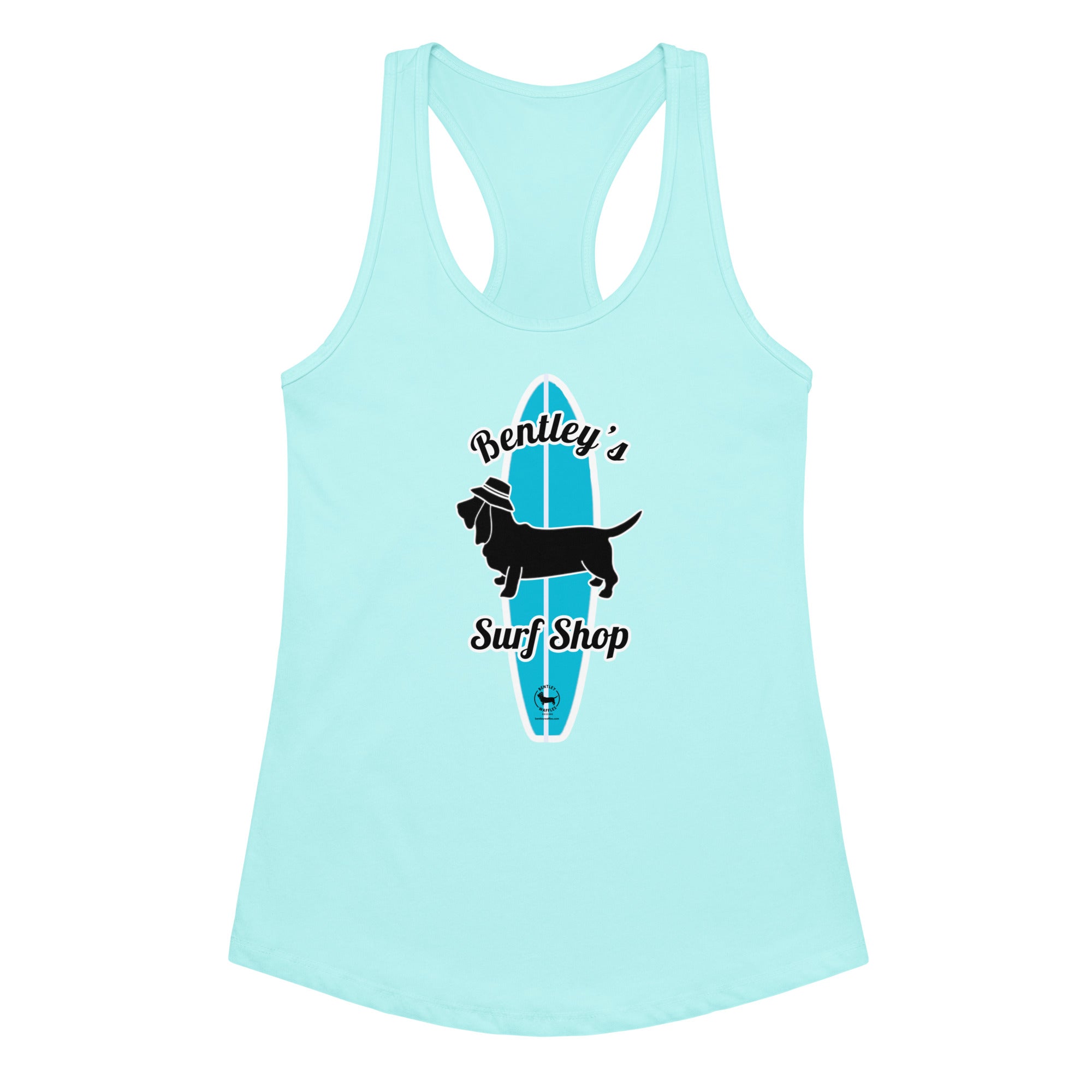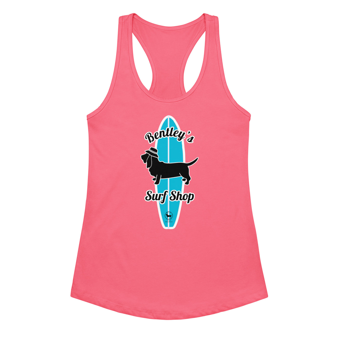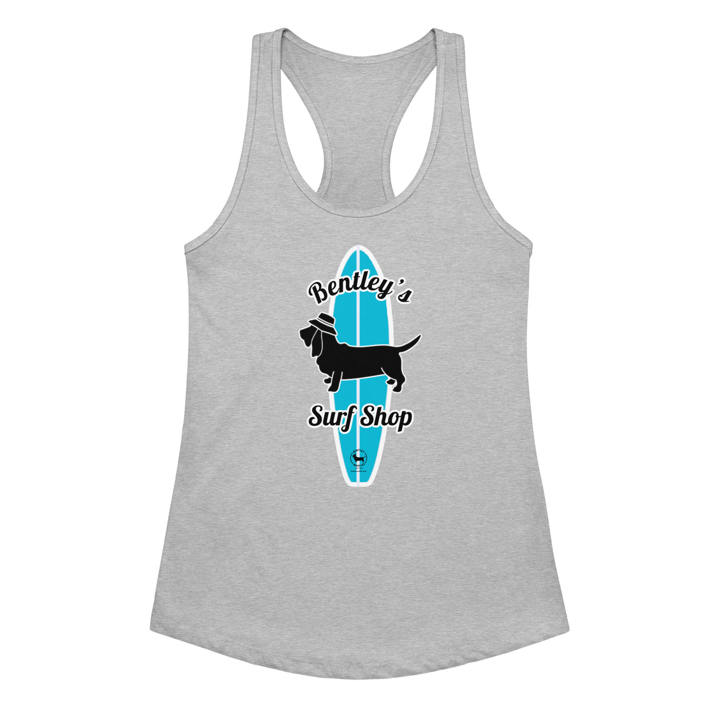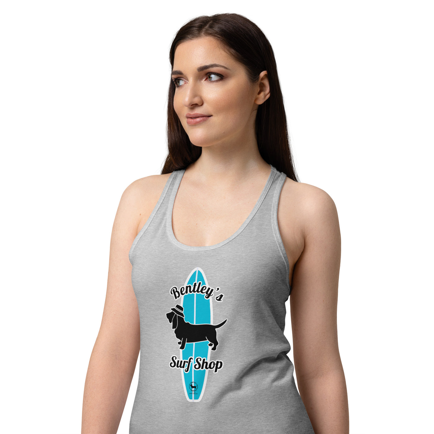 Introducing our women's fitted racerback tank top, designed for both comfort and style. This sleek top features a unique surfboard graphic and a Bentley Waffles silhouette, complemented by the text "Bentley's Surf Shop" on the front. Whether you're hitting the gym or running weekend errands, this tank offers the perfect blend of lightweight and breathable fabric, making it an ideal choice for beach days or any casual outing.