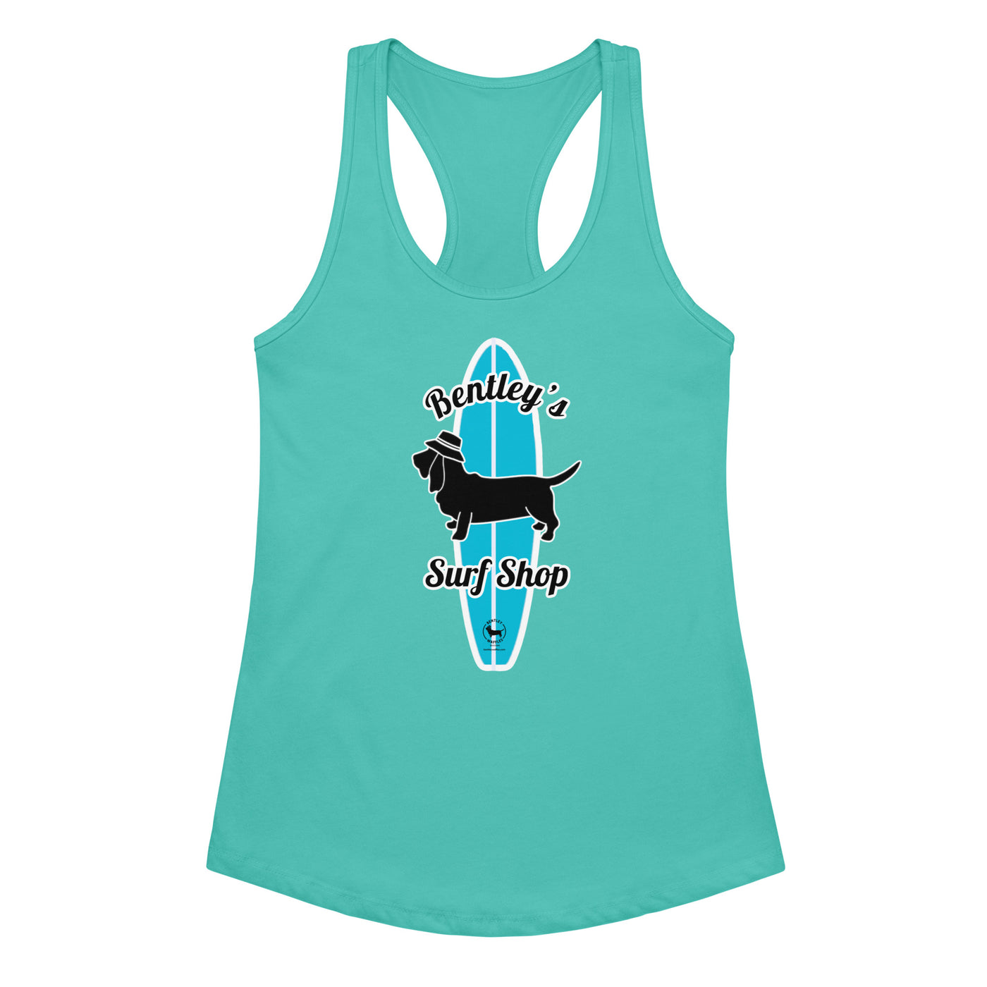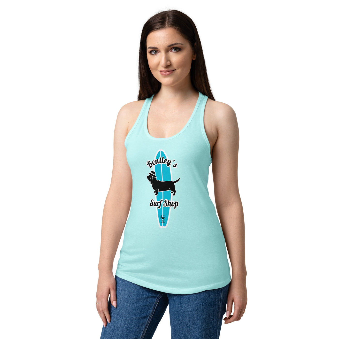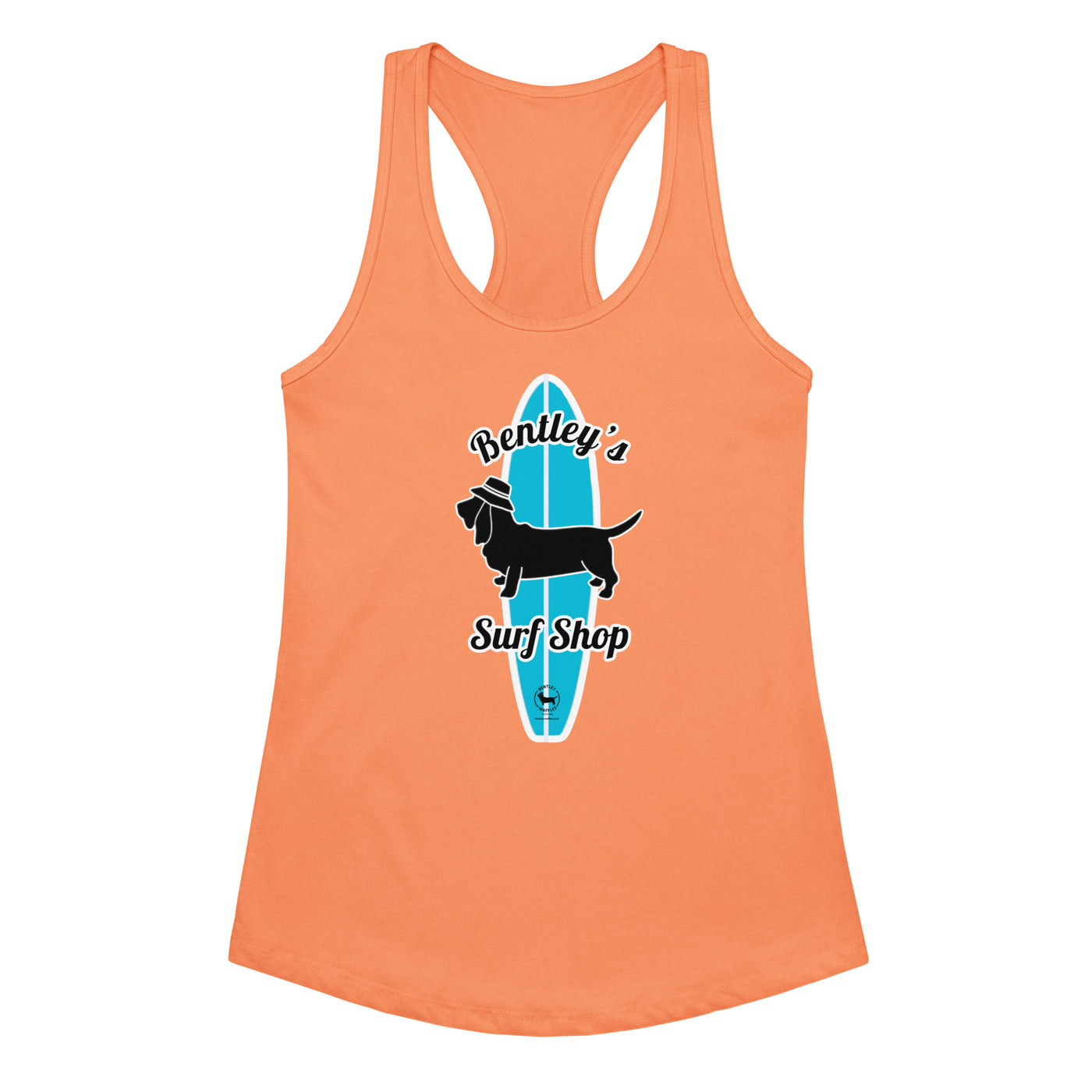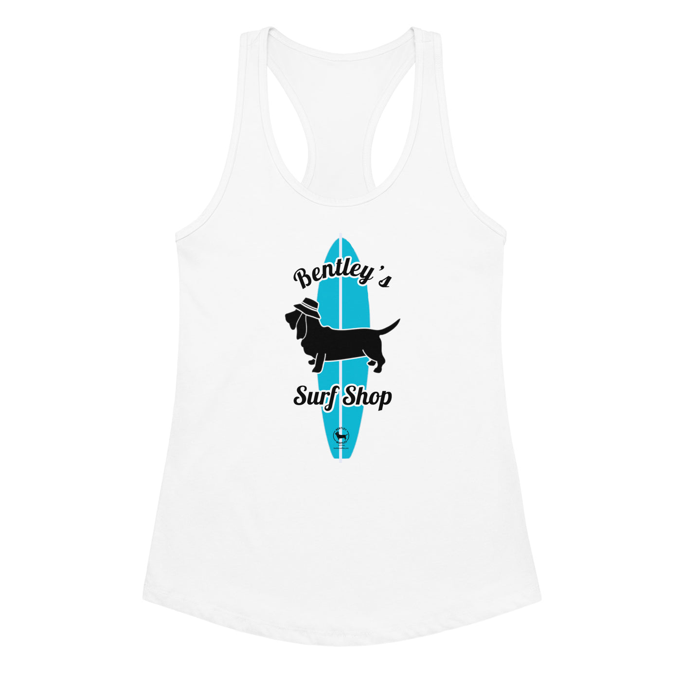 Introducing our women's fitted racerback tank top, designed for both comfort and style. This sleek top features a unique surfboard graphic and a Bentley Waffles silhouette, complemented by the text "Bentley's Surf Shop" on the front. Whether you're hitting the gym or running weekend errands, this tank offers the perfect blend of lightweight and breathable fabric, making it an ideal choice for beach days or any casual outing.