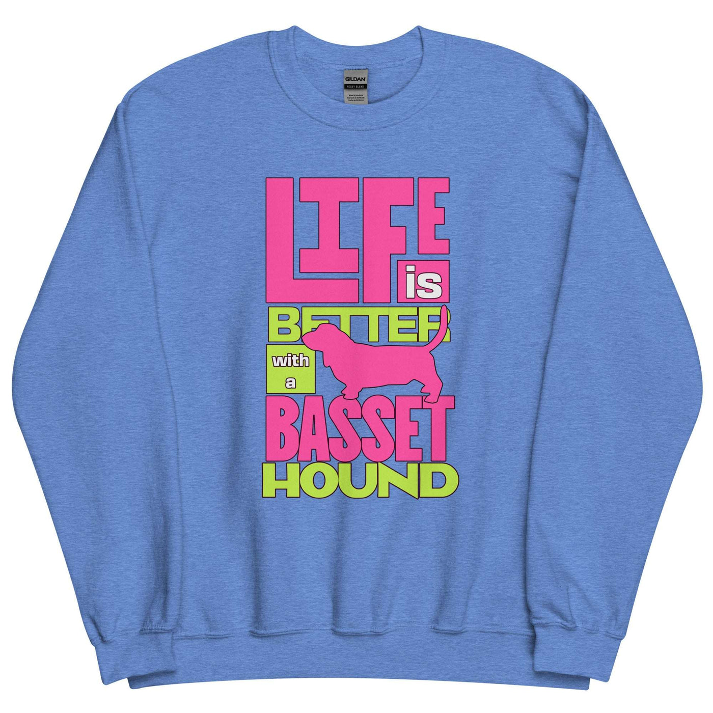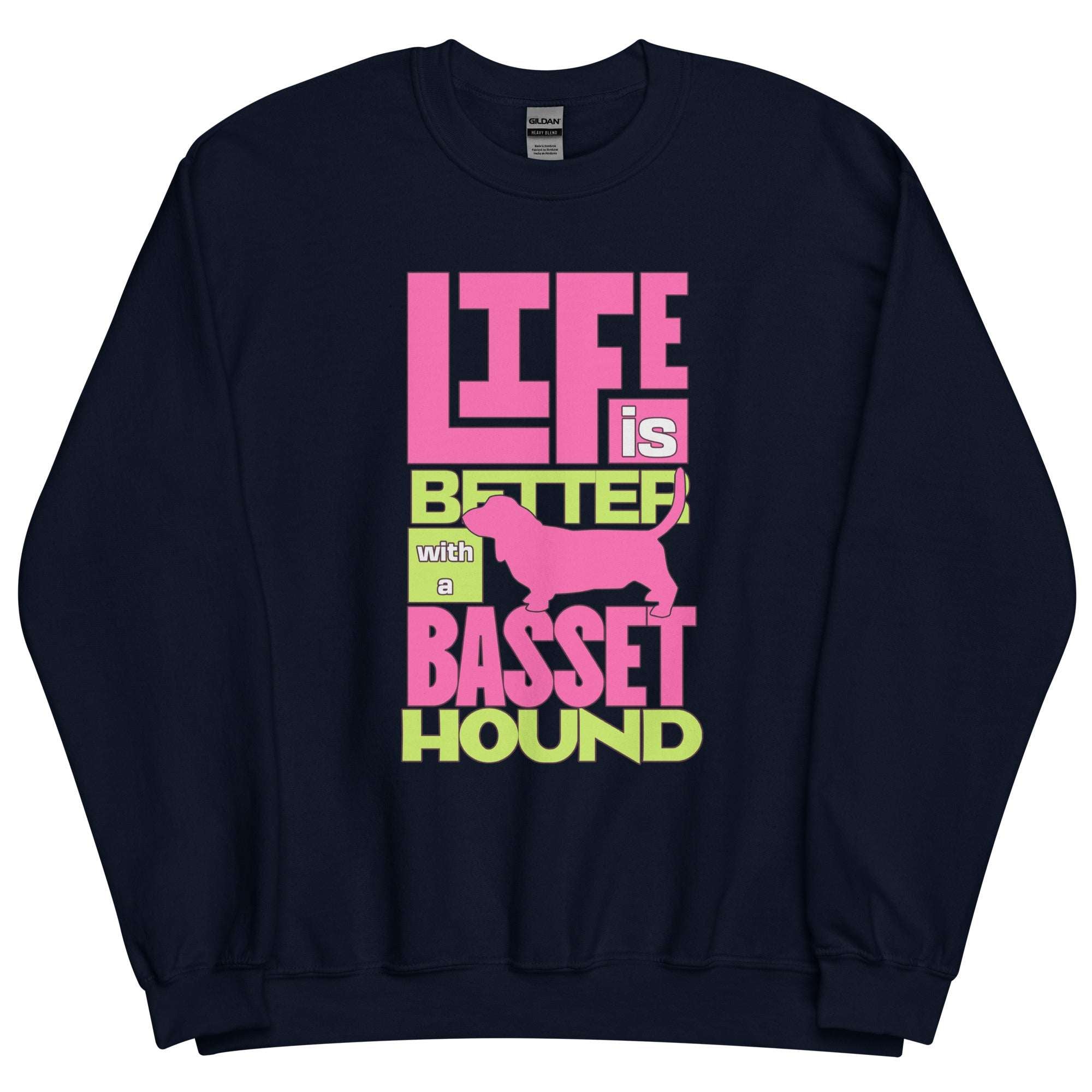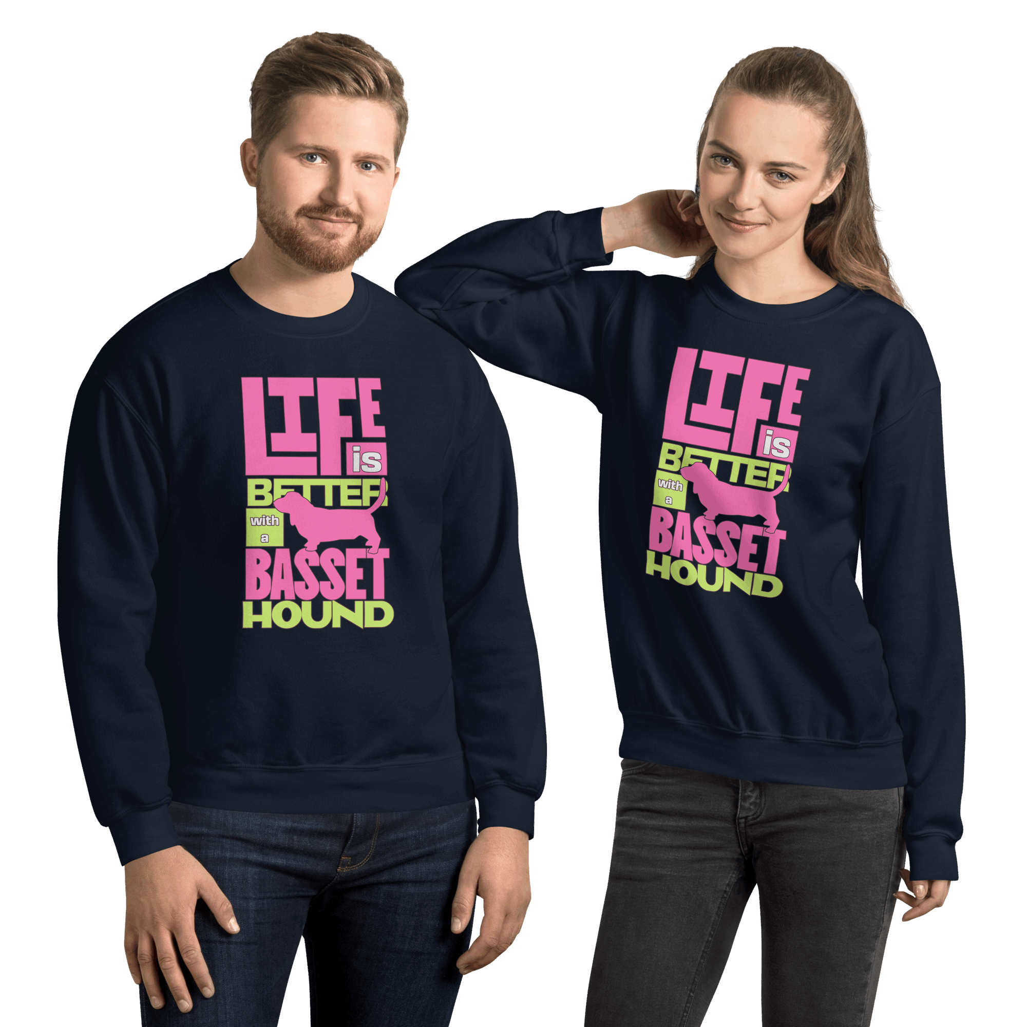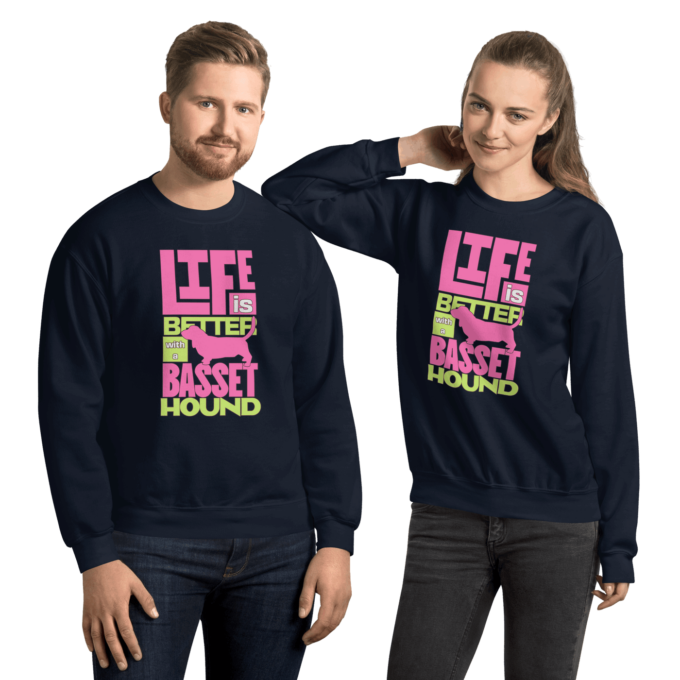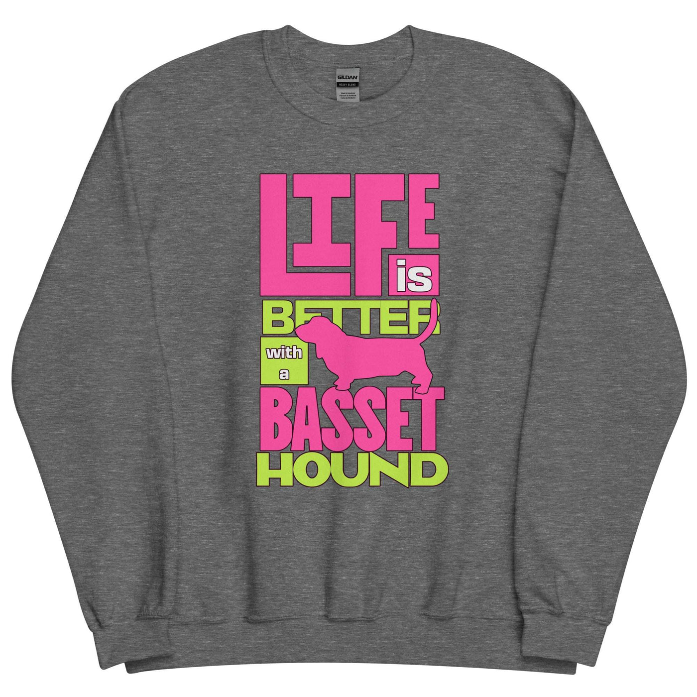 Stay cozy and stylish with our “Life is Better with a Basset Hound” sweatshirt! Crafted with a perfect blend of 50% cotton and 50% polyester, this sturdy yet soft classic-fit sweatshirt is designed for ultimate comfort all year round. Featuring an eye-catching silhouette of a basset hound and bold, vibrant lettering, it's a fun way to show off your love for our adorable companions.